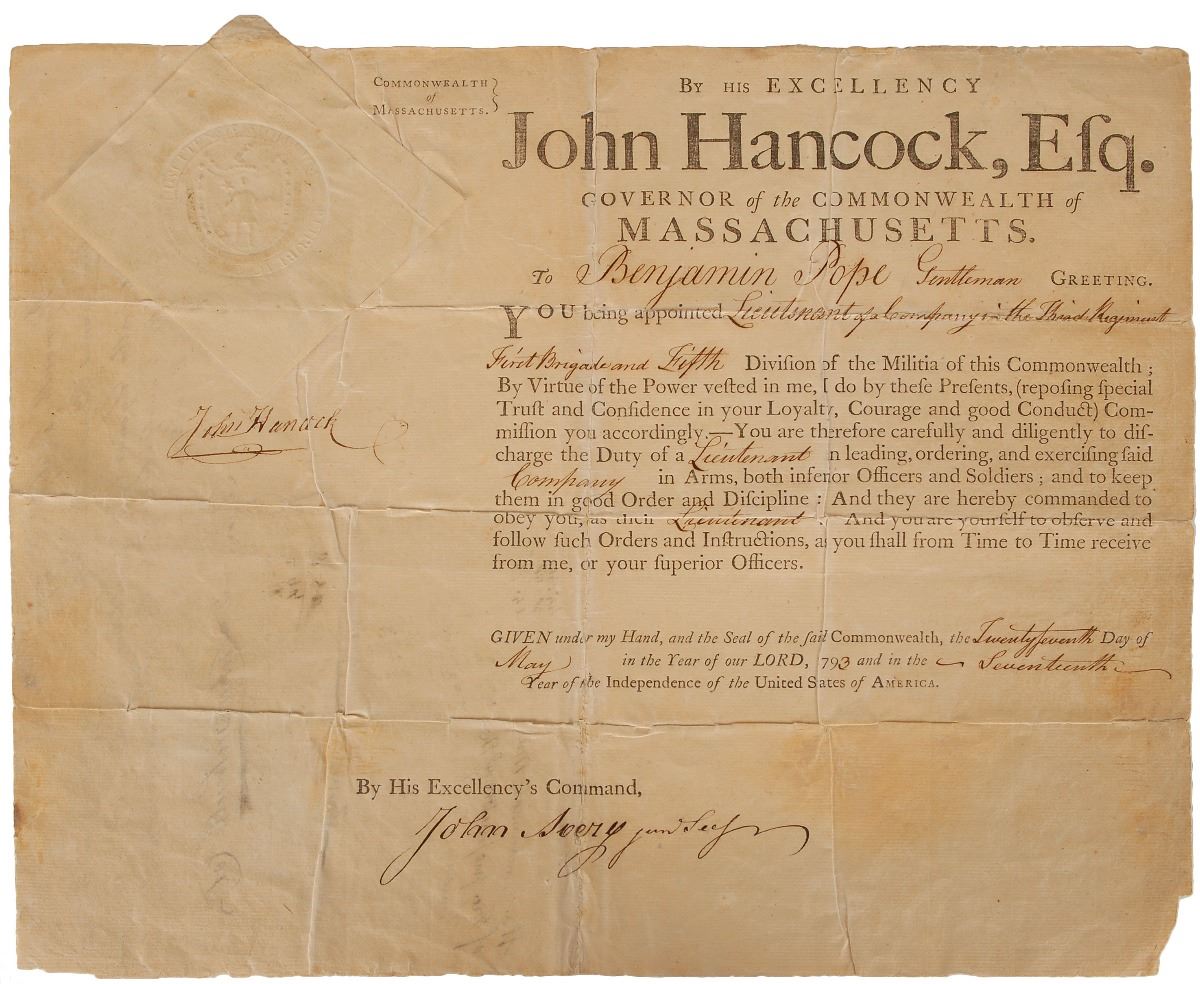 Partly-printed DS, one page, 14.5 x 12, May 27, 1793. As governor of Massachusetts, Hancock appoints Benjamin Pope as “Lieutenant of a Company in the Third Regiment, First Brigade and Fifth Division of the Militia of this Commonwealth.” Neatly signed on the left side beneath the large paper seal by Hancock, and countersigned by John Avery as secretary. In very good to fine condition, with moderate intersecting folds, and light overall toning, a bit heavier in a few places; Hancock’s signature is crossed by a crease, but remains otherwise clear and bold.