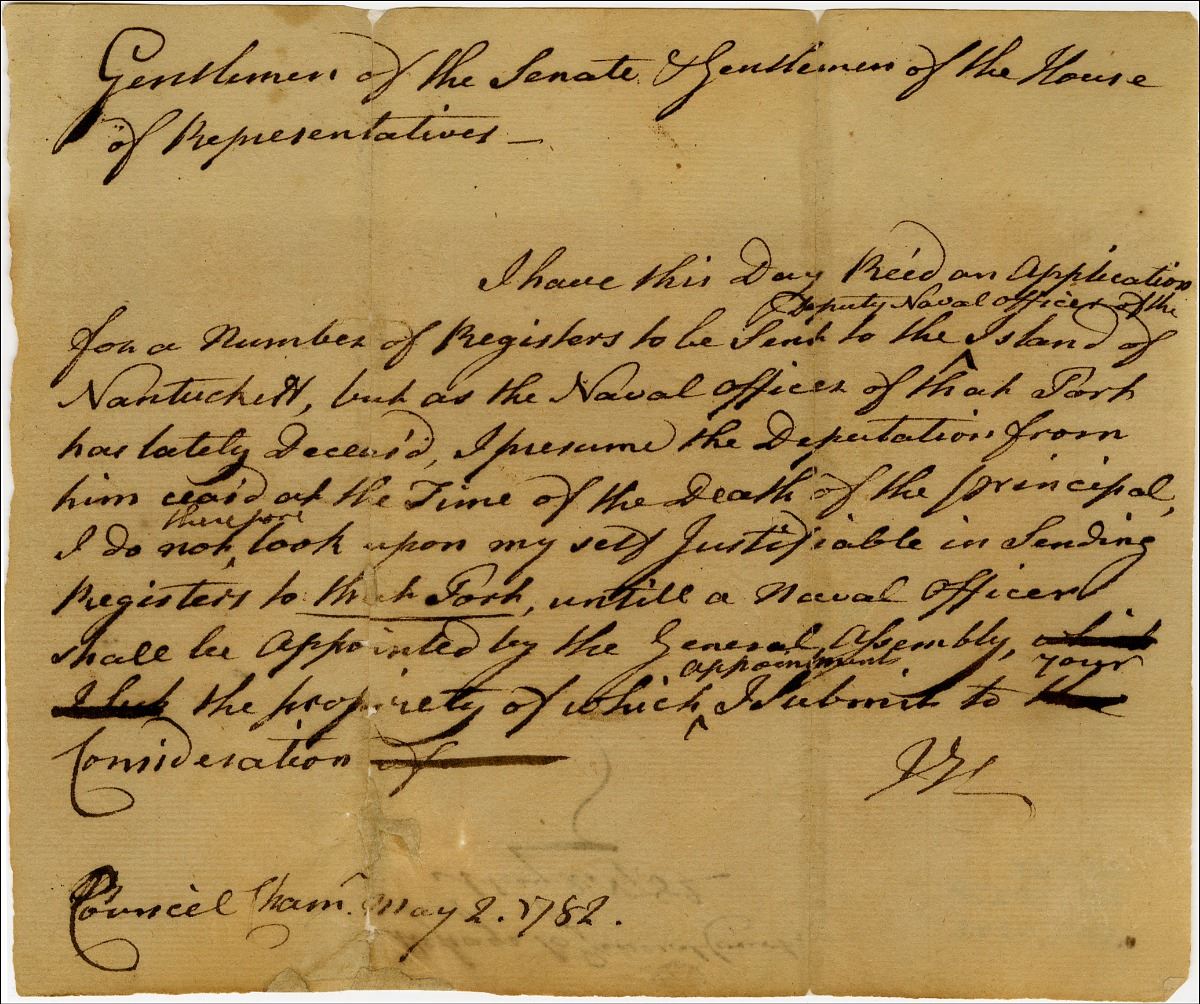 ALS signed “J. H.,” one page, 7.25 x 6, May 2, 1782. Letter to the General Court asking the assembly to appoint a naval officer to a vacancy at Nantucket, in full, “I have this day Rec’d an Application for a Number of Registers to be Sent to the Deputy Naval Officer of the Island of Nantuckett, but as the Naval Officer of that Port has lately Deceas’d, I presume the Deputations from him ceas’d at the Time of the Death of the principal, I do not therefore look upon myself Justifiable in sending Registers to that Port until a Naval Officer shall be appointed by the General Assembly, the propriety of which appointments I submit to your Consideration.” In very good to fine condition, with professional repairs to two complete vertical separations, resulting in some slight paper loss at junctions, small repaired tear on one fold, and light show through from docketing on reverse. Letter was originally part of The Hancock-Chase Collection, formerly housed at the Museum of American History. Pre-certified PSA/DNA.