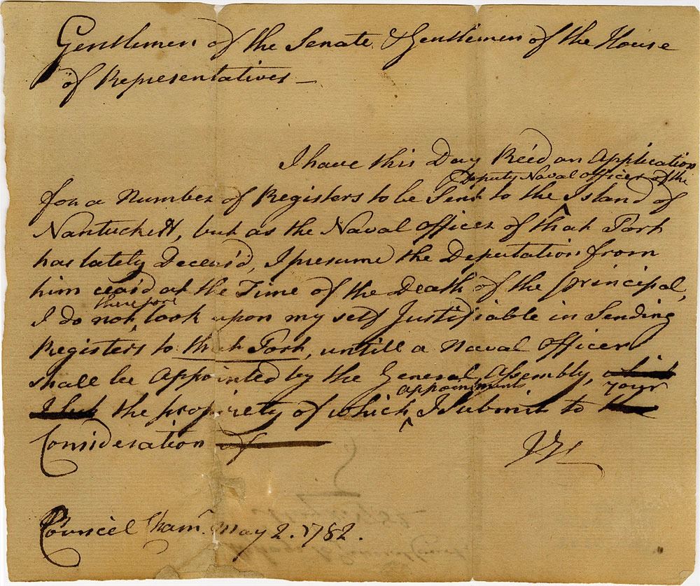 ALS signed “J. H.,” one page, 7.25 x 6, May 2, 1782. Letter to the General Court asking the assembly to appoint a naval officer to a vacancy at Nantucket, in full, “I have this day Rec’d an Application for a Number of Registers to be Sent to the Deputy Naval Officer of the Island of Nantuckett, but as the Naval Officer of that Port has lately Deceas’d, I presume the Deputations from him ceas’d at the Time of the Death of the principal, I do not therefore look upon myself Justifiable in sending Registers to that Port until a Naval Officer shall be appointed by the General Assembly, the propriety of which appointments I submit to your Consideration.” In very good to fine condition, with professional repairs to two complete vertical separations, resulting in some slight paper loss at junctions, small repaired tear on one fold, and light show through from docketing on reverse. Letter was originally part of The Hancock-Chase Collection, formerly housed at the Museum of American History.