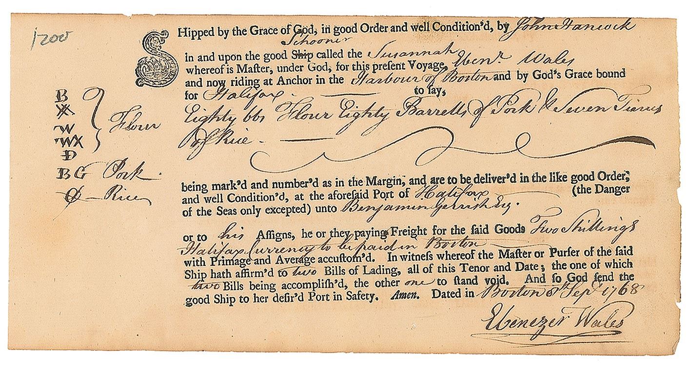 Partly-printed third-person ADS, signed within the text, "John Hancock," one page, 8.75 x 4.5, September 1768. A bill of lading, mostly filled out by Hancock, in part: "Shipped by the Grace of God, in good Order and well Condition'd, by John Hancock, in and upon the good Schooner called the Susannah whereof is Master, under God, for this present Voyage Eben'r Wales and now riding at Anchor in the Harbour of Boston and by God's Grace bound for Halifax." While the majority of the document is filled out in Hancock's hand, the contents of the shipment, including "Eighty bbs Flour" and "Eighty Barrells of Pork," was filled in by a clerk. In fine condition.