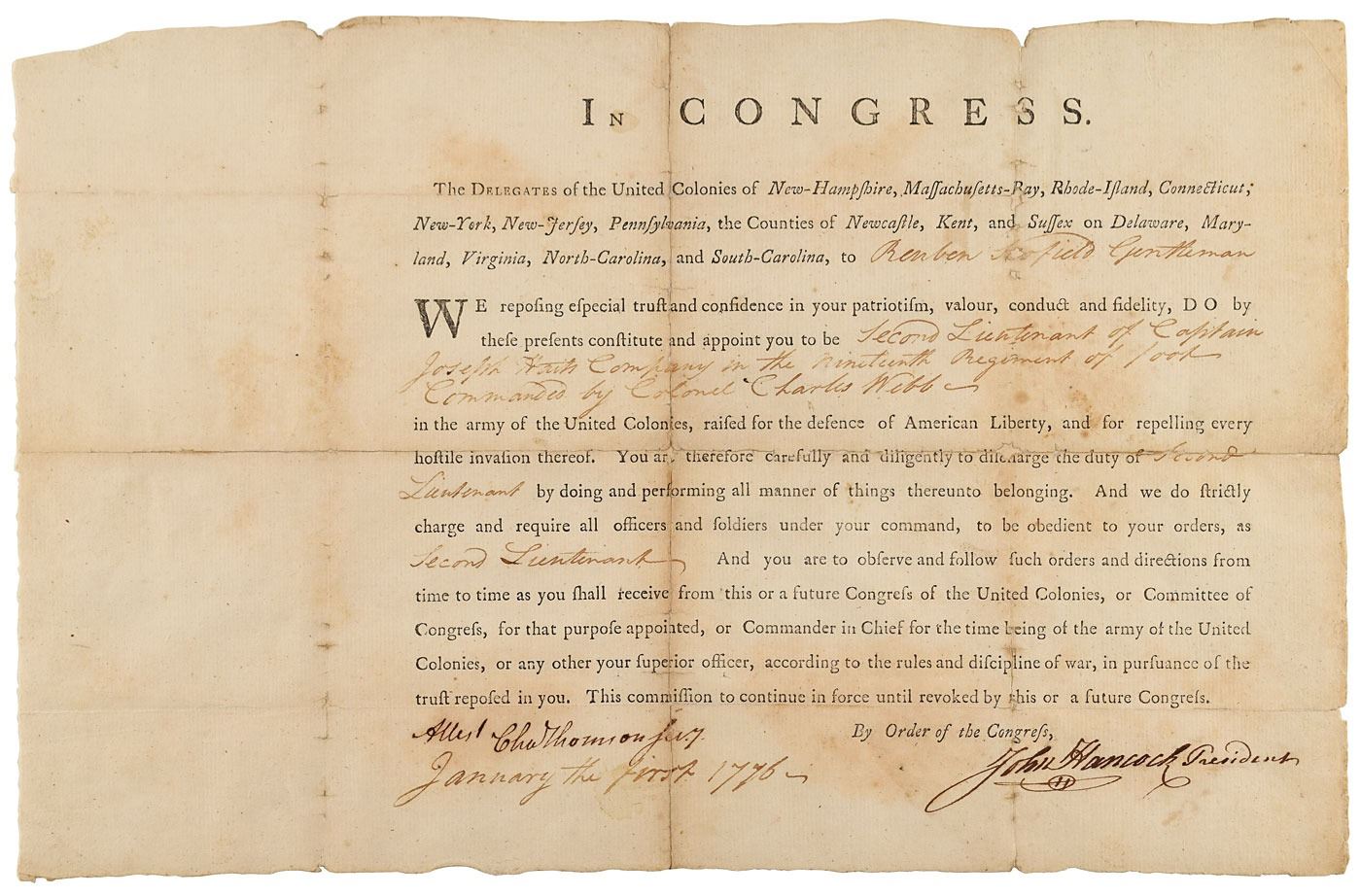 Revolutionary War-dated partly-printed DS, signed “John Hancock, President,” one page, 15.25 x 9.75, January 1, 1776. As president of the Continental Congress, Hancock appoints Reuben Scofield as a "Second Lieutenant of Captain Joseph Haits Company in the Nineteenth Regiment of foot Commanded by Colonel Charles Webb in the Army of the United Colonies, raised for the defence of American Liberty, and for repelling every hostile invasion thereof." Prominently signed at the conclusion by Hancock, and countersigned by Charles Thomson as secretary. In very good to fine condition, with scattered light toning, and archival reinforcements to the intersecting folds on the reverse.