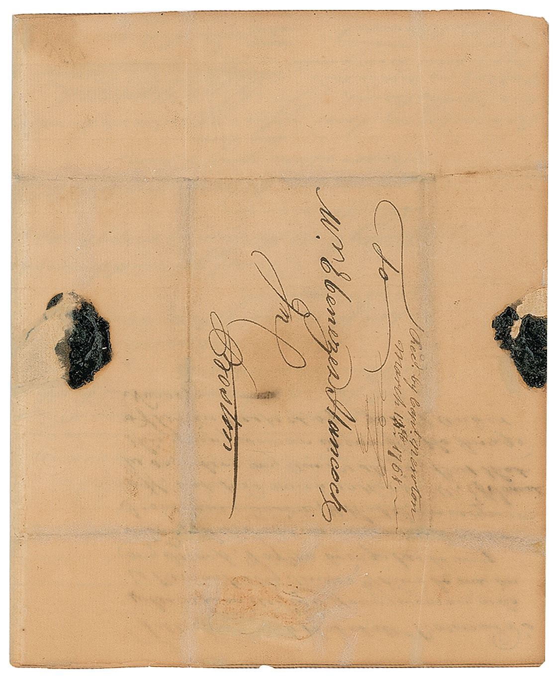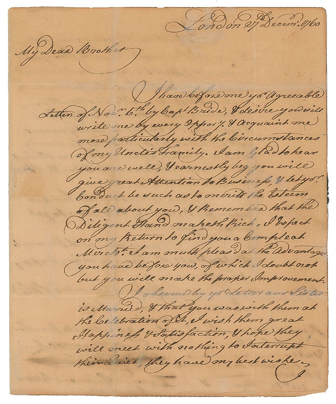 Exquisite ALS signed "Jno. Hancock," three pages on two adjoining sheets, 7 x 8.75, December 27, 1760. Letter to his brother, Ebenezer Hancock, in part: "I have before me yo'r agreeable Letters of Nov'r 6th by Capt Bride, & desire you will write one by every oppry [opportunity] & acquaint me more particularly with the Circumstances of my Uncle's Family. I am glad to hear you are well, & earnestly beg you will give great Attention to Business, & let yo'r Conduct be such as to merit the Esteem of all about you, & Remember that the Diligent Hand maketh Rich. I hope at on my Return to find you a Compleat Merch't I am much please'd at the Advantages you have before you, of which I doubt not but you will make the proper Improvement.