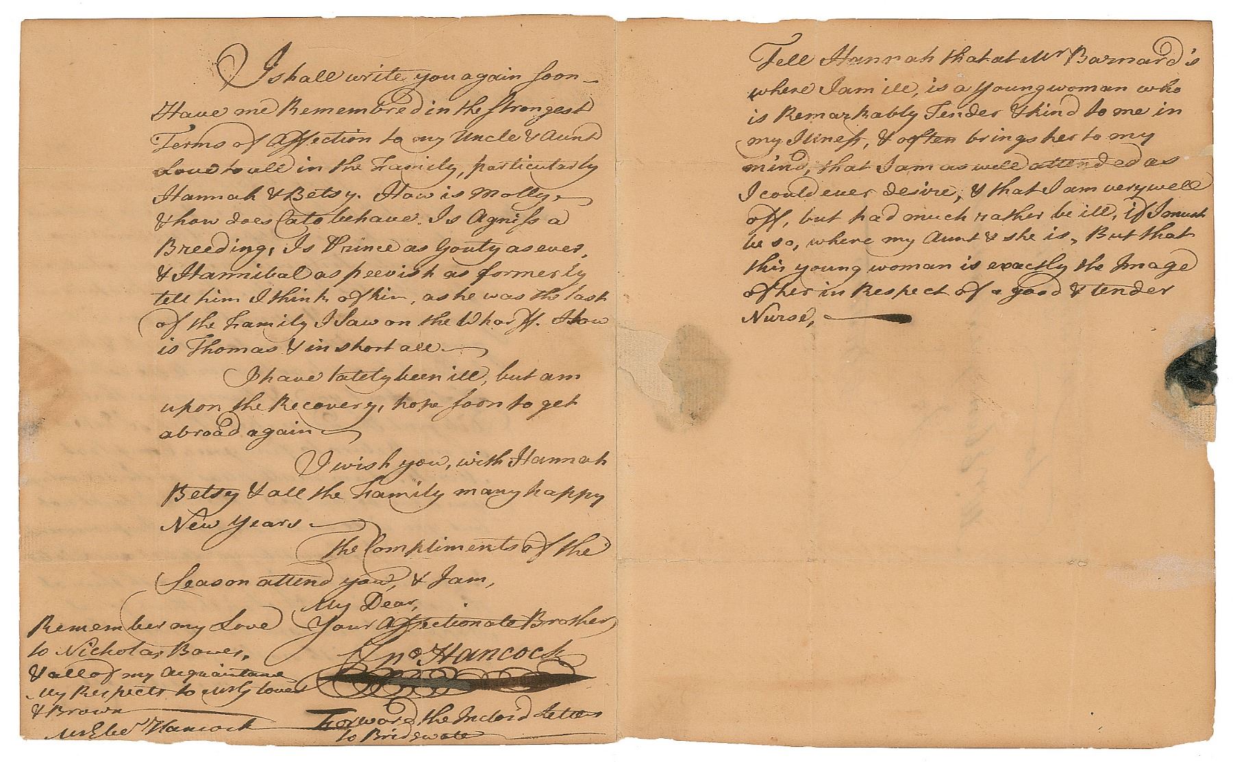 I observe by yo'r Letter our Sister is Married, & that you was with them at the Celebration of it, I wish them great Happiness & Satisfaction, & I hope they will meet with nothing to Interrupt their Quiet, they have my best wishes, I shall write you again soon. Have me Remembered in the strongest Terms of Affection to my Uncle & Aunt Love to all in the Family, particularly Hannah & Betsy. How is Molly, & how does Cate behave. Is Agniss a Breeding, Is Prince as gouty as ever, & Hannibal as peevish as formerly tell him I think of him, as he was the last of the family I saw on the Wharf. How is Thomas & in short all. I have been lately ill, but am upon the Recovery, hope soon to get abroad again. I wish you, with Hannah Betsy & all the family many happy New Years." He adds another thought to the adjoining page, in full: "Tell Hannah that Mr Barnard's where I am ill, is a young woman who is Remarkably Tender & kind to one in any Illness, & often brings her to my mind, that I am as well attended as I could ever desire, & that I am very well off, but had much rather be ill, if I must be so, where my Aunt & she is, But that this young woman is exactly the Image of her in Respect of a good and tender Nurse." Also addressed on the reverse by Hancock, "To Mr Ebenezer Hancock Jr., Boston." In very good to fine condition, with archival reinforcements to the intersecting folds, and repaired seal-related paper loss to the integral address leaf.