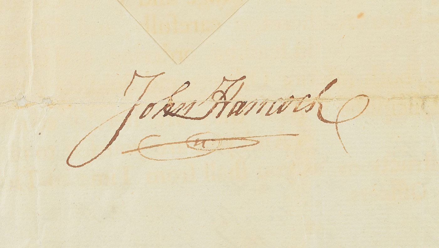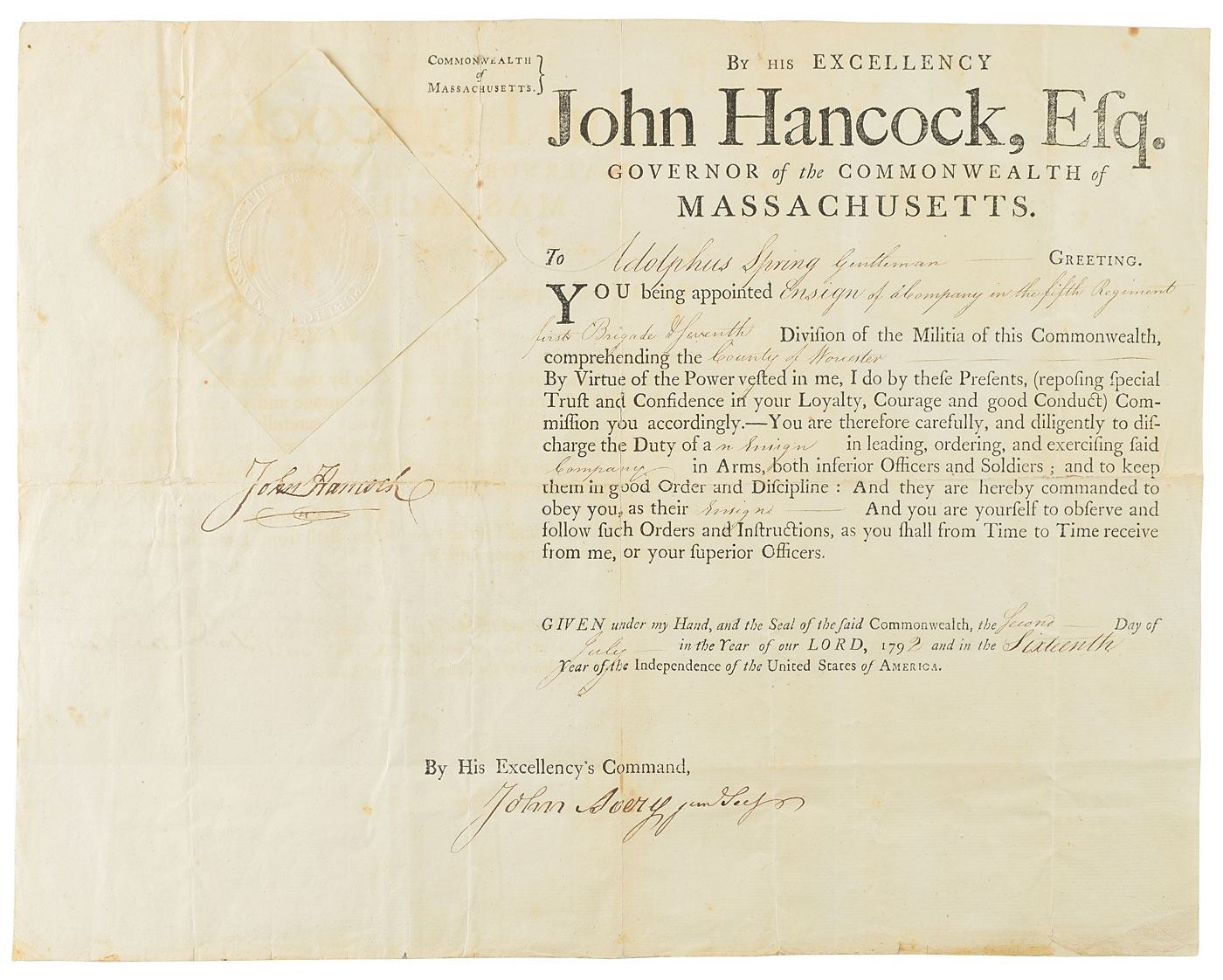 Partly-printed DS, one page, 15.75 x 12.25, July 2, 1792. As governor of Massachusetts, Hancock appoints Adolphus Spring as "Ensign of a Company in the fifth Regiment first Brigade of Seventh Division of the Militia of this Commonwealth, comprehending the County of Worcester." Boldly signed on the left side by Hancock, and countersigned by John Avery as secretary. The official seal affixed to the upper left is intact. In very good to fine condition, with light toning and creasing, and repairs on the reverse to splitting along some of the several intersecting folds.
