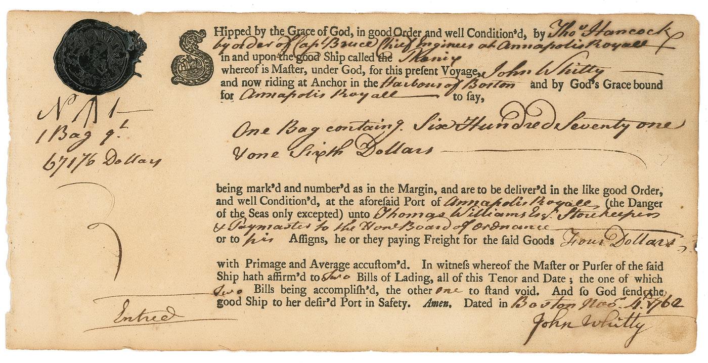 Partly printed unsigned DS filled out in Hancock’s hand (and including his surname “Hancock”), one page, 9 x 4.5, November 4, 1762. A bill of lading. In part: “Shipped by the Grace of God, in good Order and well Condition’d, by Tho’ Hancock by order of Captain Bruce Chief Engineer…in and upon the good Ship called the Thanix whereof is Master, under God, for this present Voyage, John Whitty and now riding at Anchor in the Harbour of Boston and by God’s Grace bound for Annapolis Royall to say, One bag containing Six Hundred Seventy One & one sixth Dollars.” Light toning and soiling, light creasing and wrinkling, and a rough left edge, otherwise fine condition. Pre-certified PSA/DNA and RRAuction COA.