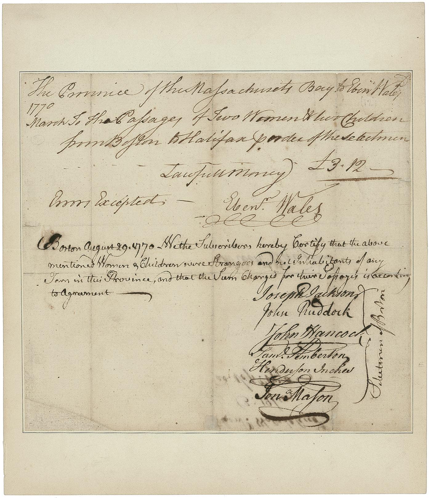 Manuscript DS, one page, 8.25 x 7.75, August 29, 1770. Hancock and five other Selectmen of Boston authorize passage of “two women & their children from Boston to Halifax per order of the Selectmen.” Signed at the conclusion by Hancock, Joseph Jackson, Samuel Pemberton, Henderson Inches, and Jonathan Mason. Document has been inlaid to a slightly larger sheet. In very good condition, with previous intersecting folds, one through a single letter of signature, several professional repairs to separations and paper loss, some mild toning, and light show-through from docketing along bottom.