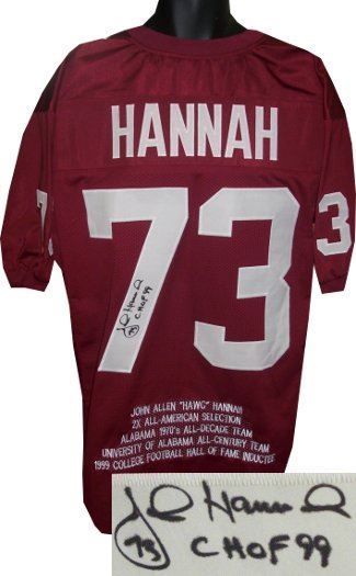 John Hannah played tackle and guard for the University of Alabama under Coach Paul "Bear" Bryant from 1970 until 1972, and earned All American honors twice. During his tenure Hannah was part of an SEC championship-winning team. He was named to the University of Alabama All-Century Team and also to the Alabama 1970s All-Decade team. Hannah was inducted into the College Football Hall of Fame in 1999. Bryant would later say that Hannah was the greatest lineman he ever coached. John Hannah has hand autographed this Alabama Crimson Tide Maroon Custom Throwback Jersey with CHOF 99 inscription with Embroidered Stats. Certificate of Authenticity from Athlon Sports.