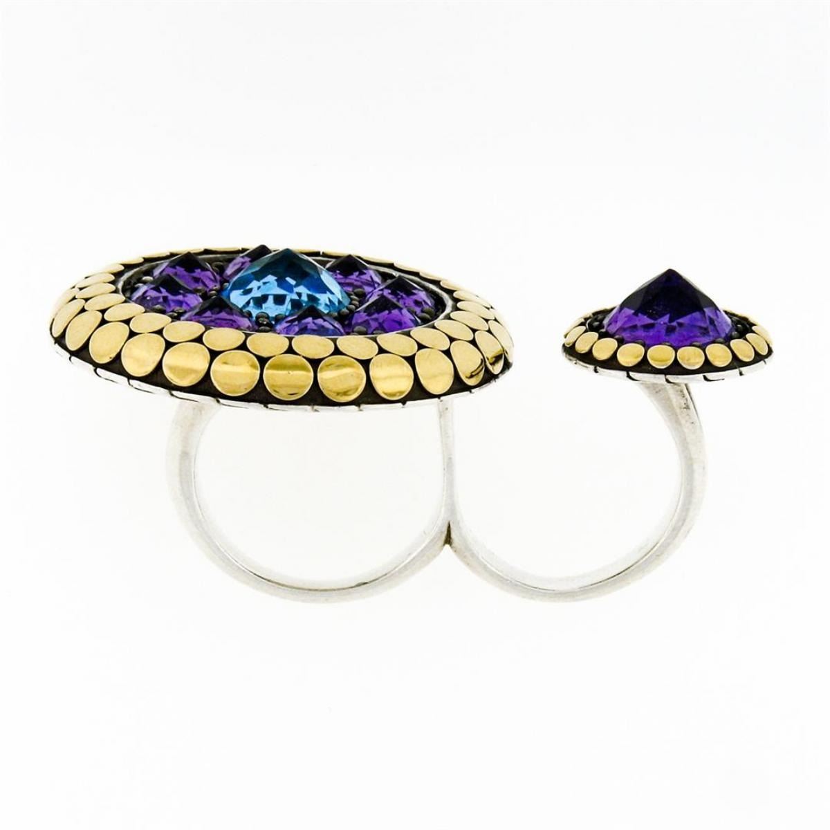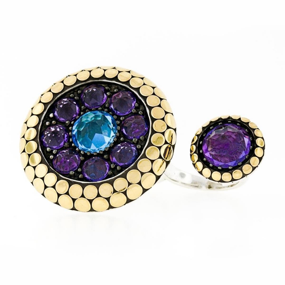 One 100% Guaranteed Authentic John Hardy Dot 18k Gold & Silver Amethyst & Blue Topaz Two Finger Statement Ring. Item Details: Material: Solid .925 Sterling Silver and 18k Yellow Gold, Weight: 28.25 Grams, Stone(s): (1) Natural Genuine Topaz - Rose Cut - Prong Set - Ocean Blue Color - 10.4mm (approx.), (9) Natural Genuine Amethyst - Rose Cut - Prong Set - Purple Color - (8) 6.2mm - (1) 10.1mm (approx.), Ring Size: 8.5 (larger circle) and 7 (smaller circle) (We can custom size this ring. Please contact us prior to purchase for sizing inquiry), Diameter: 35.2mm (larger circle), 15.7mm (smaller circle), Signature(s): 925 18k Hardy , Condition: Estate designer piece. Shows slight wear. Excellent overall and ready to wear.