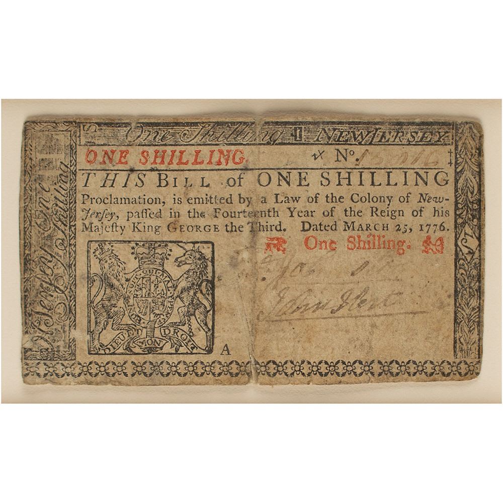 Revolutionary War-dated Colonial New Jersey engraved bank note for "One Shilling," 4 x 2.25, issued as No. 15016, and reading: ‰ÛÏThis Bill of One Shilling Proclamation, is emitted by a Law of the Colony of New-Jersey, passed in the Fourteenth Year of the Reign of his Majesty King George the Third. Dated March 25, 1776.‰Û Signed at the conclusion by John Hart, and countersigned by John Johnston, whose signature is barely visible. Printed in Burlington, New Jersey by Isaac Collins, with reverse bearing the cautionary message: "'Tis Death to Counterfeit." Archivally mounted and framed to an overall size of 10.5 x 9. In very good to fine condition, with overall soiling, a central vertical fold, and Hart's signature light but completely legible.