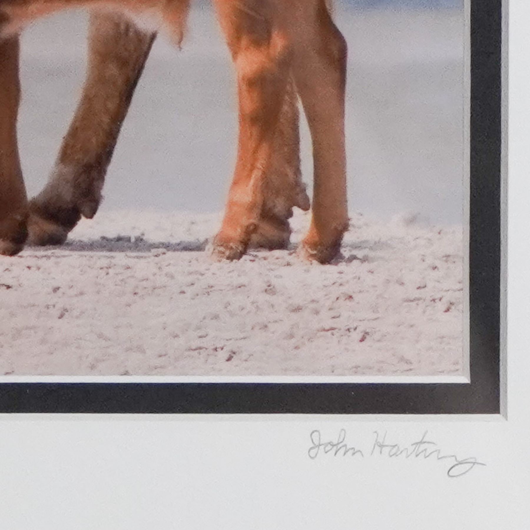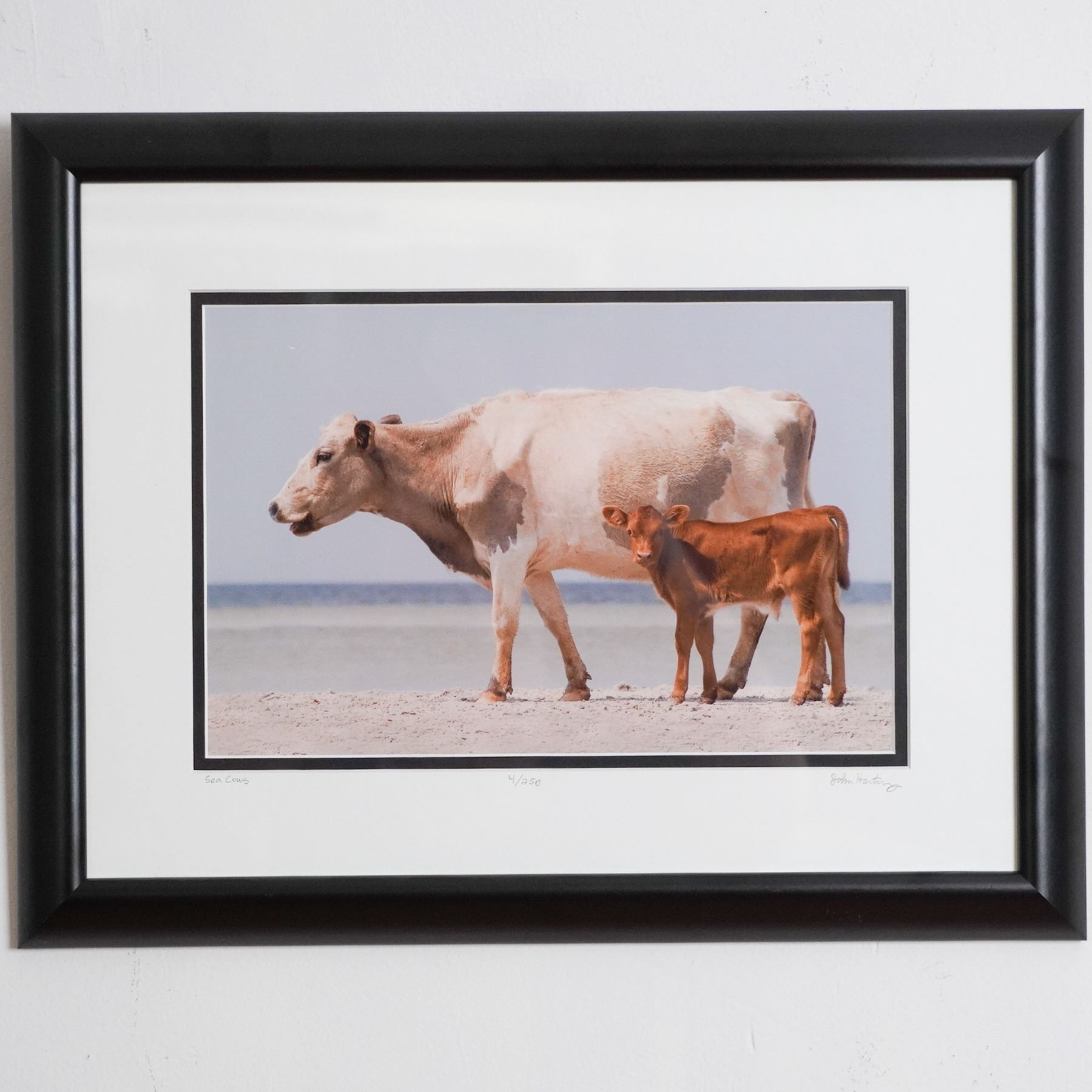 This framed photograph by John Harting captures a serene coastal scene featuring a cow and calf, showcasing the artist's keen eye for wildlife and nature photography. The image is signed by Harting in the lower right corner of the mat, adding to its authenticity. The subjects, known as the Sea Cows of North Carolina's Cedar Island, are a unique and historic herd that has roamed the region's coastal dunes for centuries. Framed and matted, measuring 19"L x 14"H, this piece is an excellent addition to any photography or nature-themed collection.
