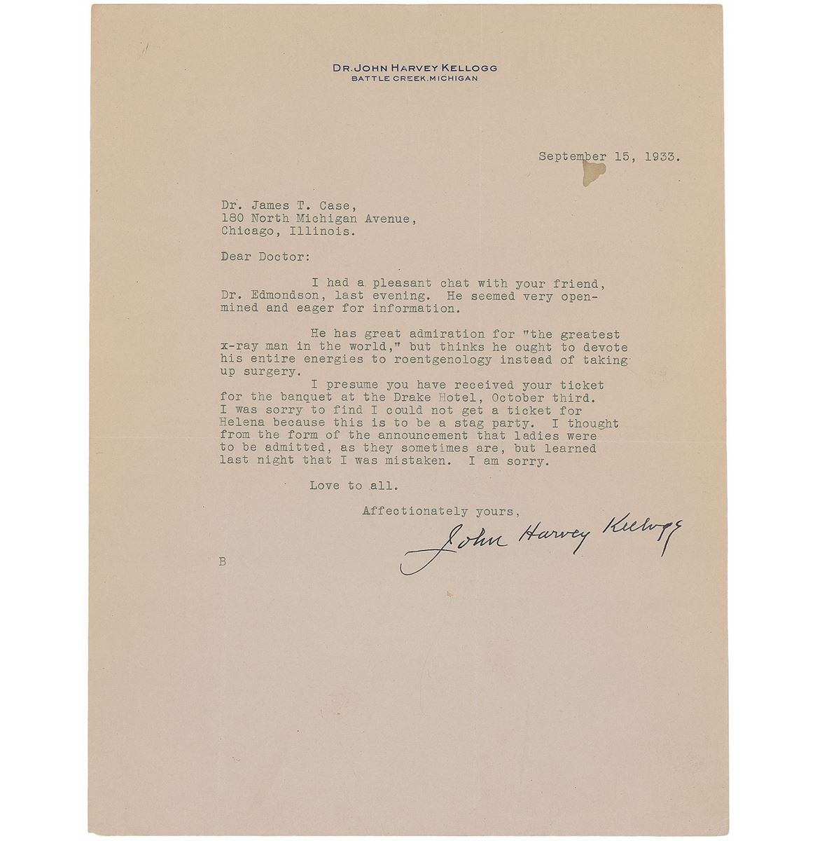Physician and promoter of health foods (1852–1943) best known for his invention of Corn Flakes. TLS, one page, 8.5 x 11, personal letterhead, September 15, 1933. Letter to James Case, in part: “I had a pleasant chat with your friend, Dr. Edmondson, last evening. He seemed very open-mined [sic] and eager for information. He has great admiration for ‘the greatest x-ray man in the world,’ but thinks he ought to devote his entire energies to roentgenology instead of taking up surgery.” In fine condition, with intersecting folds (one vertical fold passing through a single letter of the signature) and a spot of soiling.