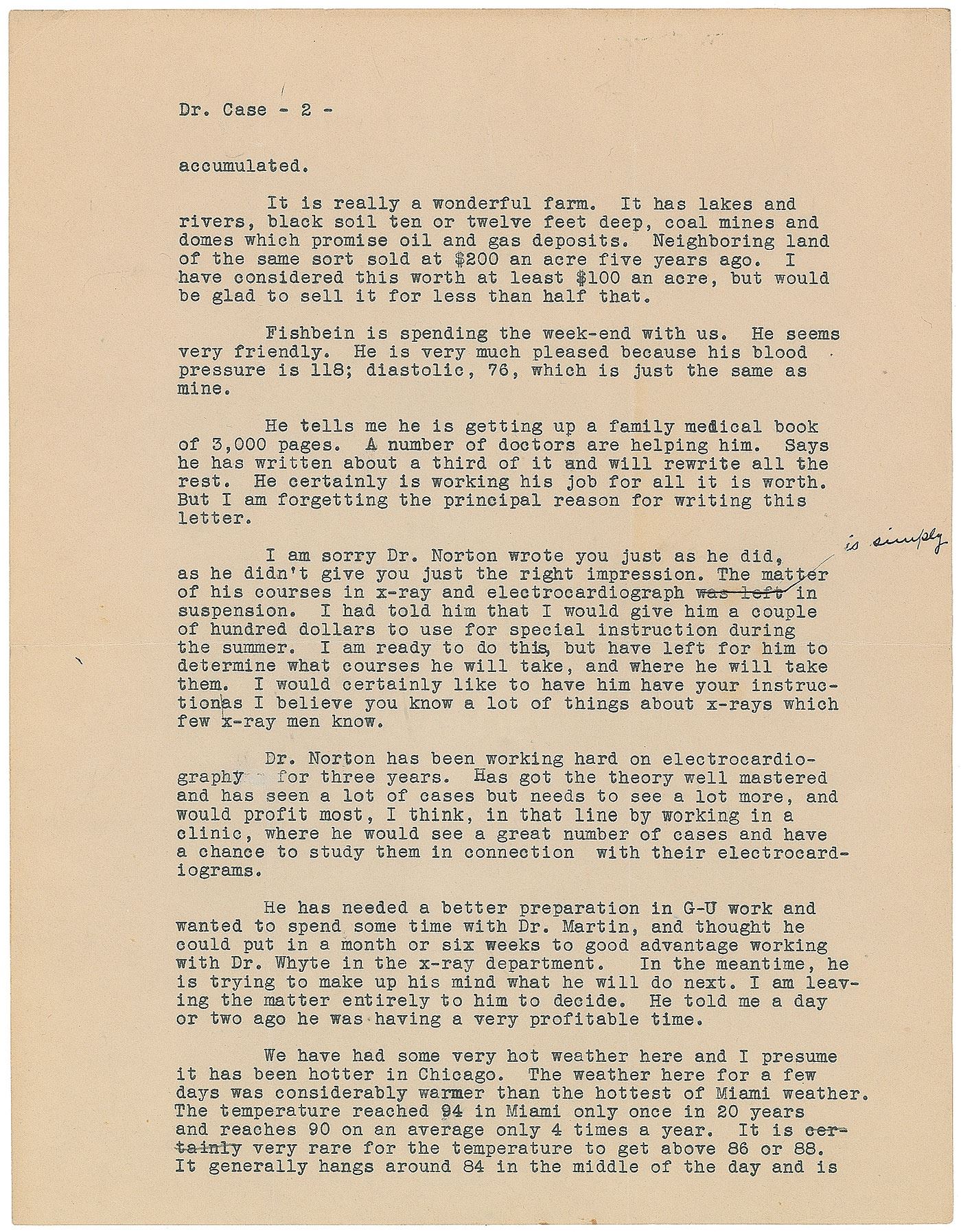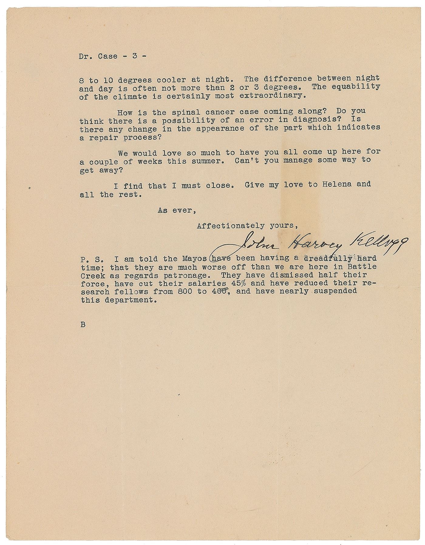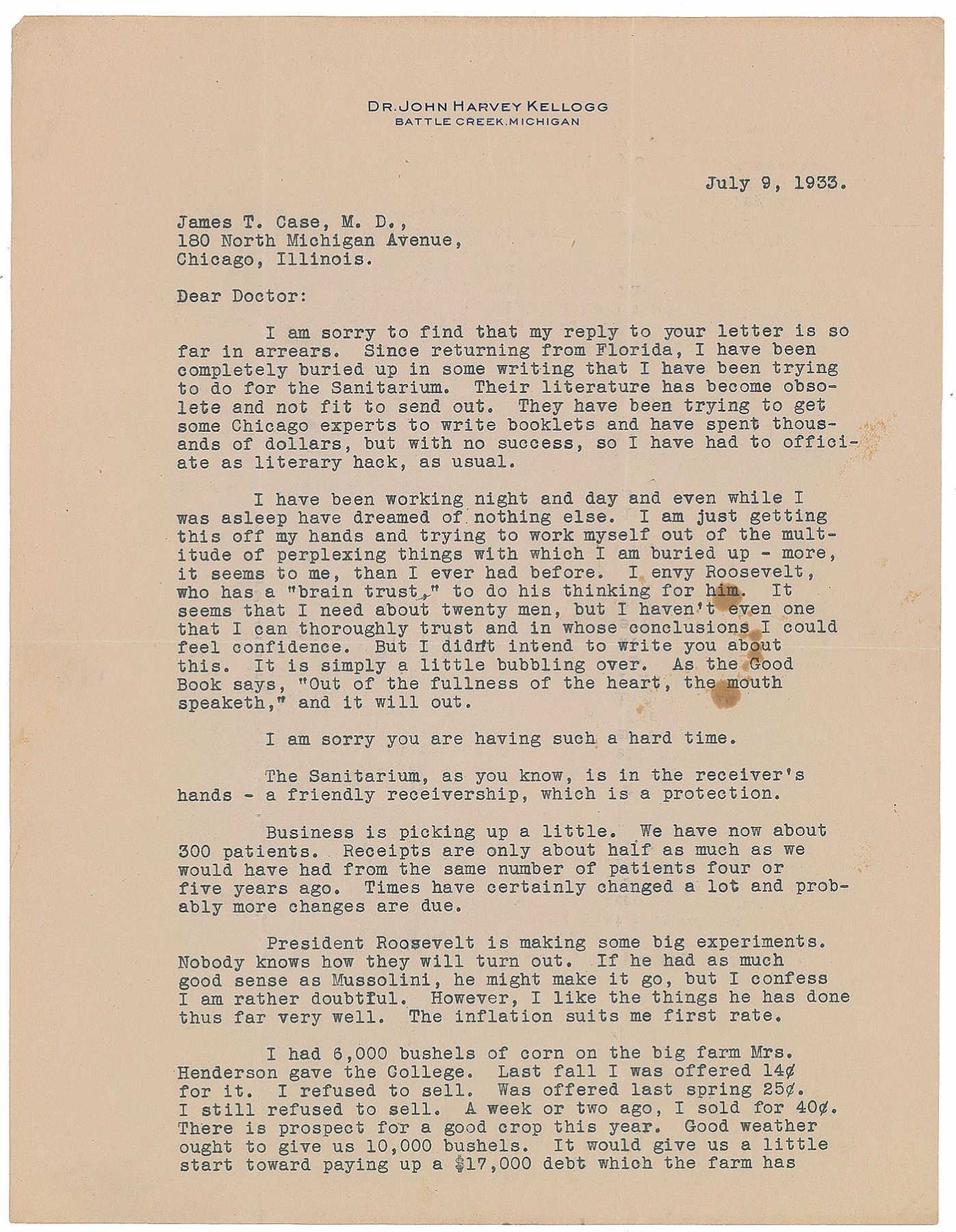 Physician and promoter of health foods (1852–1943) best known for his invention of Corn Flakes. TLS, three pages, 8.5 x 11, personal letterhead, July 9, 1933. Letter to Dr. James T. Case, in part: "I have been completely buried up in some writing that I have been trying to do for the Sanitarium…I have been working night and day and even while I was asleep have dreamed of nothing else…I envy Roosevelt, who has a 'brain trust' to do his thinking for him…The Sanitarium, as you know, is in the receiver's hands—a friendly receivership, which is a protection. Business is picking up a little…President Roosevelt is making some big experiments. Nobody knows how they will turn out. If he had as much good sense as Mussolini, he might make it go, but I confess I am rather doubtful…I had 6,000 bushels of corn on the big farm Mrs. Henderson gave the College. Last fall I was offered 14¢ for it. I refused to sell. Was offered last spring 25¢. I still refused to sell. A week or two ago, I sold for 40¢…Good weather ought to give us 10,000 bushels. It would give us a little start toward paying up a $17,000 debt which the farm has accumulated…I am sorry Dr. Norton wrote you just as he did, as he didn't give you just the right impression. The matter of his courses in x-ray and electrocardiograph is simply in suspension…I would certainly like to have him have your instruction, as I believe you know a lot of things about x-rays which few x-ray men know. Dr. Norton has been working hard on electrocardiography for three years. Has got the theory well mastered and has seen a lot of cases…How is the spinal cancer case coming along?…P.S. I am told the Mayos have been having a dreadfully hard time; that they are much worse off than we are here in Battle Creek." In fine condition, with a few scattered stains.