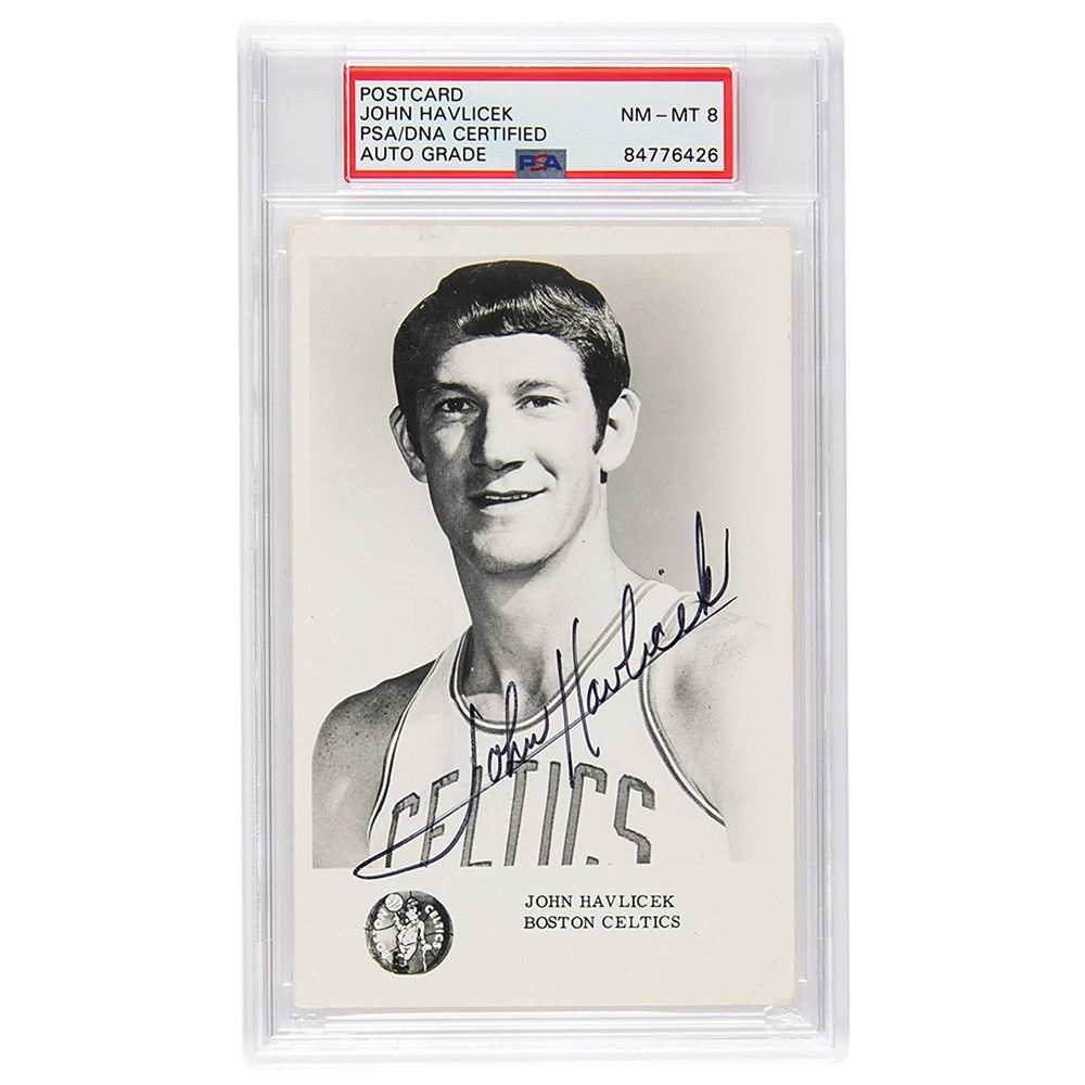 Glossy 3.5 x 5.5 postcard photo of Boston Celtics legend John Havlicek, signed in black felt tip. In fine condition, with one small corner crease. Encapsulated and graded by PSA/DNA as "NM-MT 8."