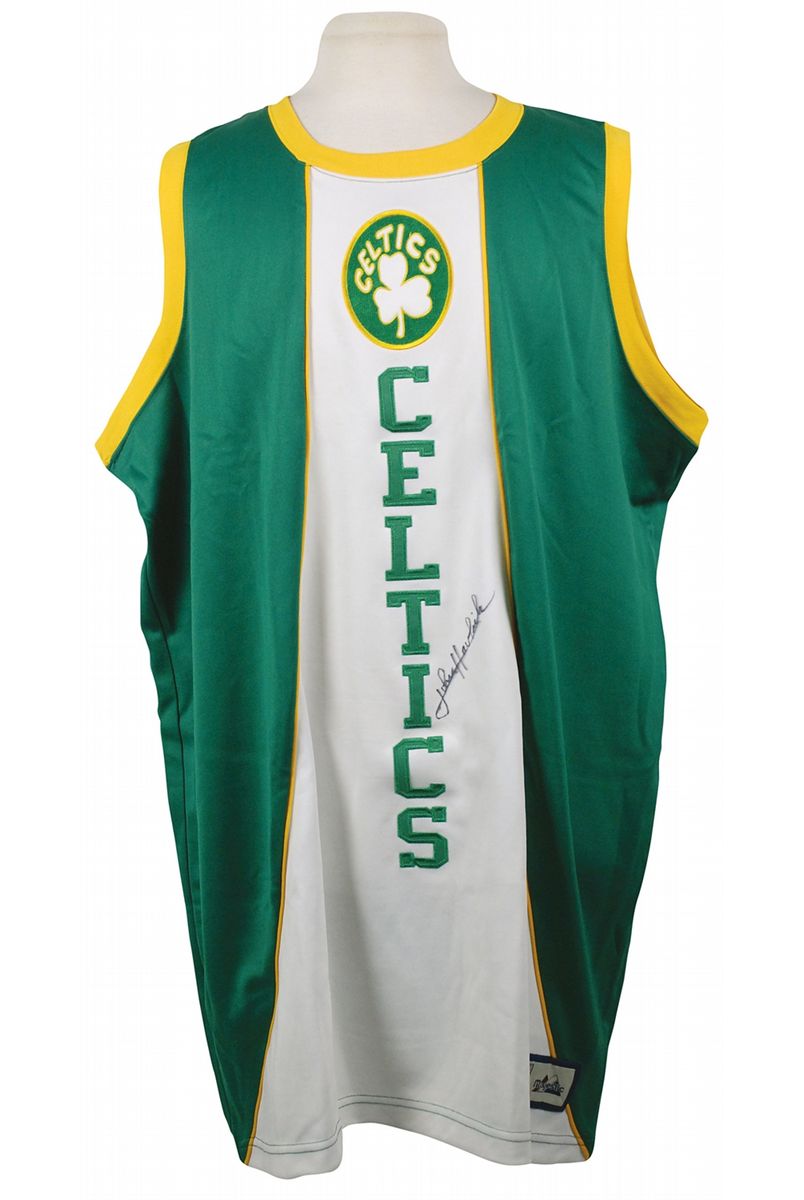 Official Majestic replica Hardwood Classics Boston Celtics basketball jersey, with sewn on letters and numbers, signed in black felt tip on the front. In fine condition, with some slight spreading of ink on material.