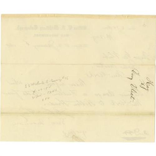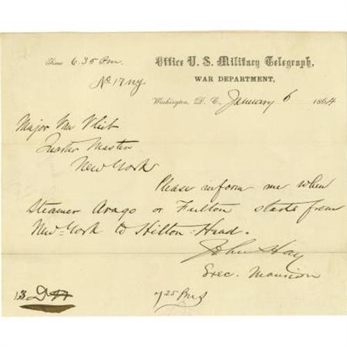 <B>John Hay Document Signed</B></I> 8” x 6.5”, partially printed, Office U.S. Military Telegraph, War Department form, January 6, 1864, New York. Hay asks Major Van Vliet to inform him of the sailing of the steamers <I>Arago</B></I> or <I>Fulton</B></I> from New York to Hilton Head. Hay (1838-1905) was private secretary and assistant to Abraham Lincoln. Archival tape repair at the fold, else near fine. <I>From the collection of Henry E. Luhrs.</B></I><BR><BR><BR><b>Shipping:</b> Flat Material, Small (<a target="_blank" href="http://www.heritageauctions.com/common/shipping.php">view shipping information</a>)