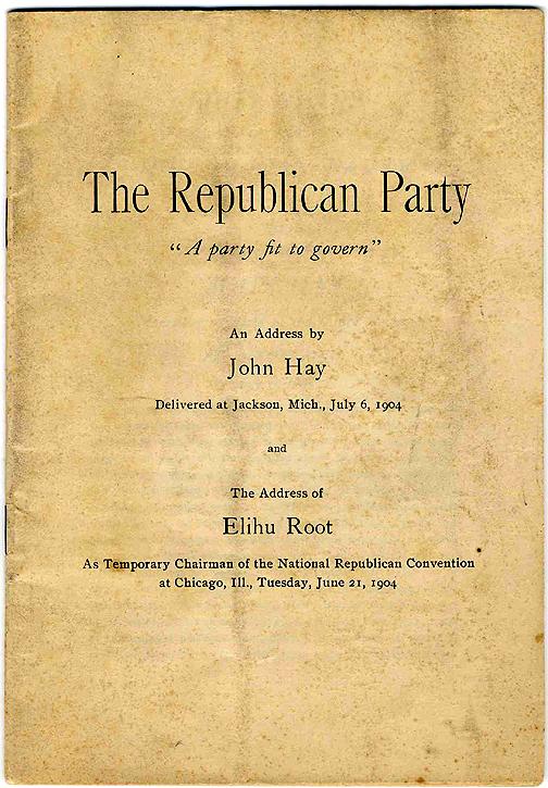 ''The Republican Party'' by John Hay and Elihu Root, 1904. 48pp booklet presents “Fifty Years of the Republican Party” and “A Party Fit to Govern.” Also contains an address by John Hay, Secretary of State of the United States, delivered in Jackson, MI on 6 July 1904. Outside cover is somewhat soiled. Interior is very clean. Measures approximately 5.5'' x 8''. Very good condition.