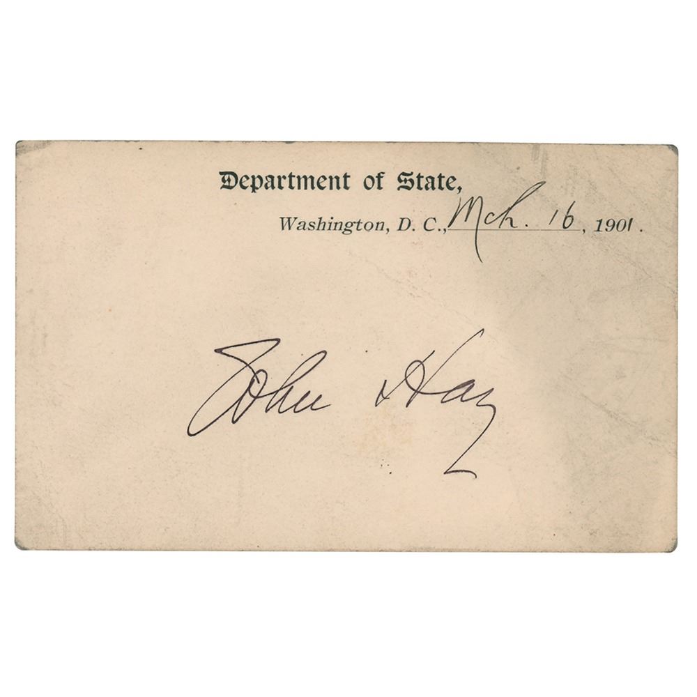 Private secretary (1838–1905) to and, later, biographer of Abraham Lincoln who also served as secretary of state under McKinley and Roosevelt. Ink signature, "John Hay,†on an official off-white 5 x 3 Department of State card, dated March 16, 1901. In very good to fine condition, with diagonal creasing to the upper right.