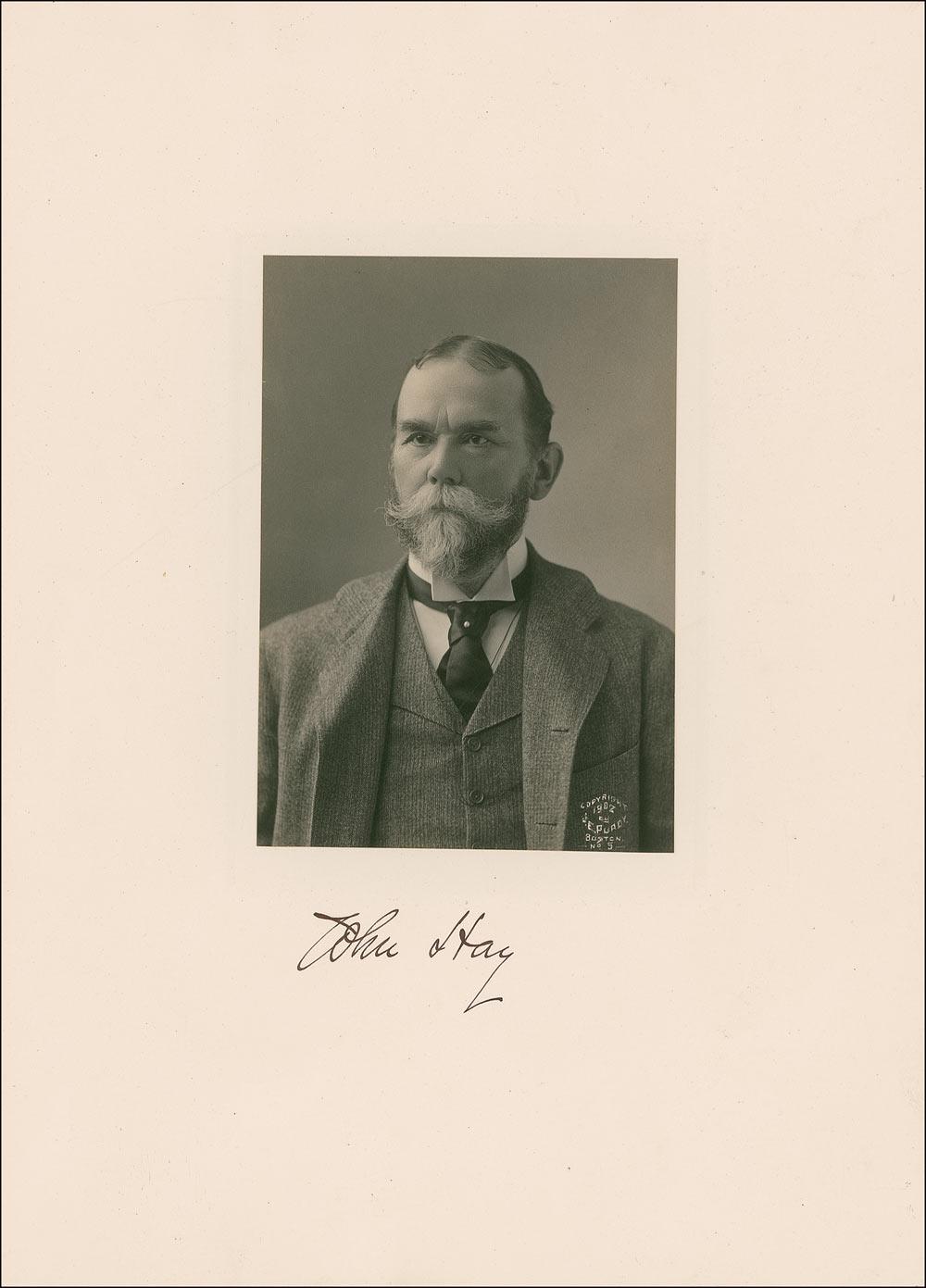 Private secretary (1838–1905) to and, later, biographer of Abraham Lincoln who also served as secretary of state under McKinley and Roosevelt. Vintage matte-finish 4 x 5.5 J. E. Purdy of Boston studio portrait affixed to its signed 8.75 x 12 mount, signed in fountain pen “John Hay.” The photo is affixed within its 9 x 12.5 presentation folder. In fine condition. A remarkably bold signature!