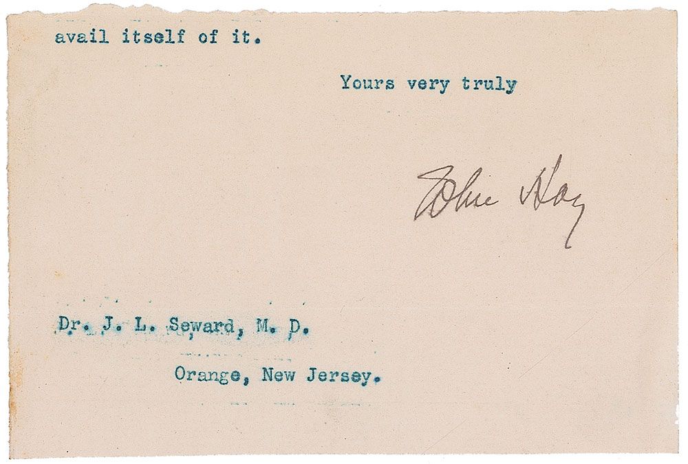 Private secretary (1838–1905) to and, later, biographer of Abraham Lincoln who also served as secretary of state under McKinley and Roosevelt. Ink signature, “John Hay,” on an off-white 4.75 x 3.25 slip clipped from the close of a letter. In fine condition.