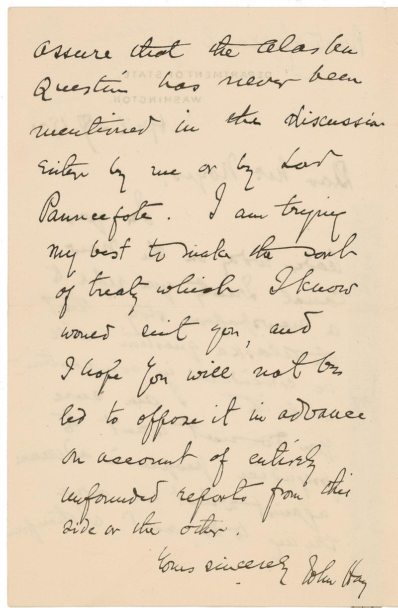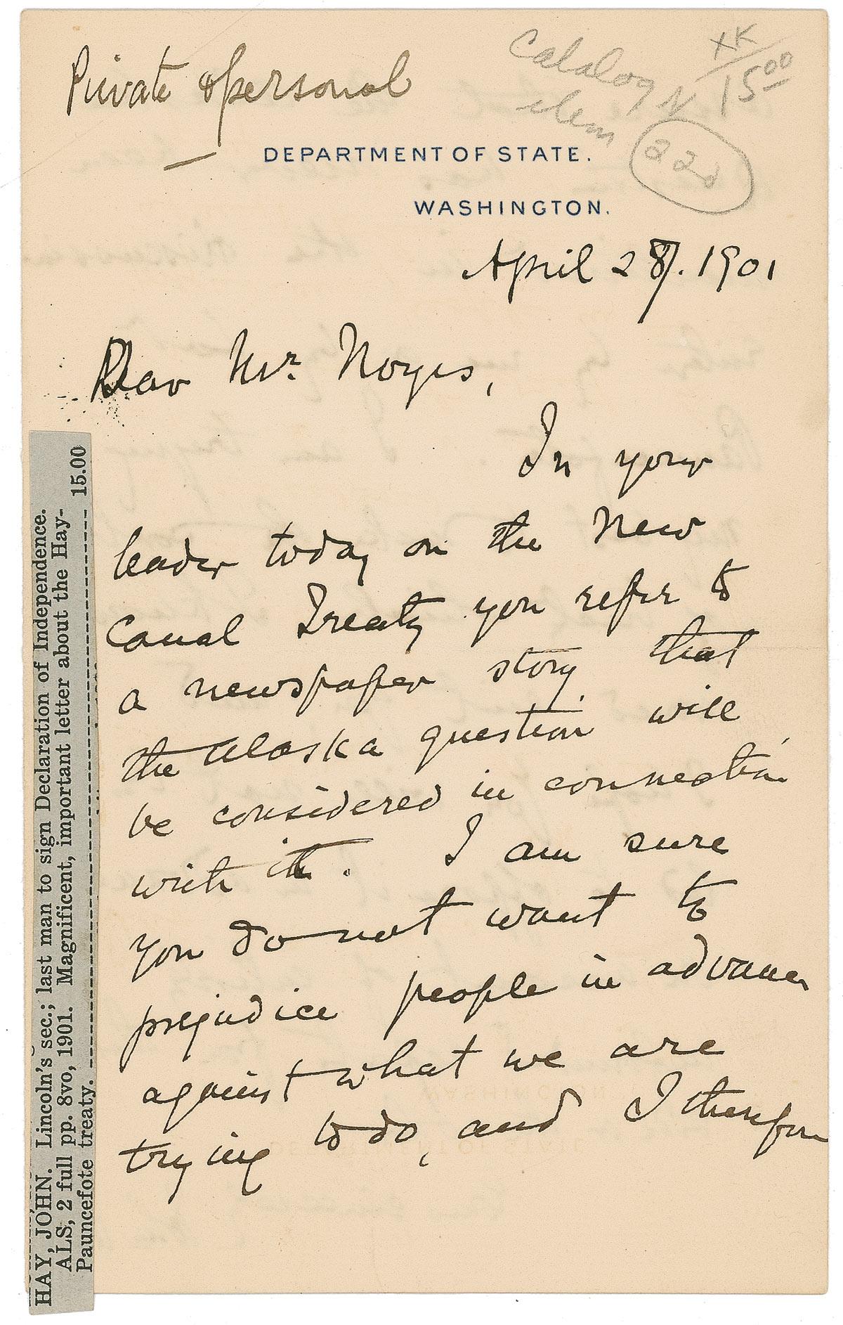 Private secretary (1838–1905) to and, later, biographer of Abraham Lincoln who later served as secretary of state under McKinley and Roosevelt. ALS, one page both sides, 4.5 x 7, Department of State letterhead, April 28, 1901. Marked “Private & personal” at the top of the page, Hay writes Mr. Noyes regarding “the Alaska question” and the Hay-Pauncefote Treaty that opened the door for the Panama Canal. In part: “You refer to a newspaper story that the Alaska question will be considered in connection with it. I am sure you do not want to prejudice people in advance against what we are trying to do, and I therefore assure that the Alaska Question has never been mentioned in the discussion either by me or by Lord Pauncefote. I am trying my best to make the sort of treaty which I would know would suit you, and I hope you will not be led to oppose it in advance on account of entirely unfounded reports from this side or the other.” In fine condition, with pencil notations at the top of the first page, and an old dealer’s catalog description pasted vertically along the left side of the first page.