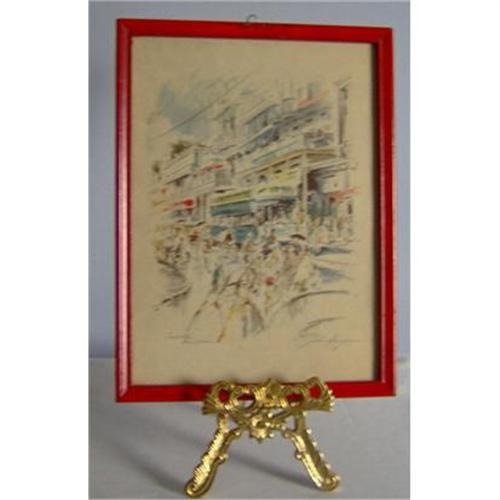 This John Haymson handcolored pen and ink print, "Calcutta Street Scene", was apparently drawn in the 1940s, as the vintage of the bus in the scene indicates. The print shows the assemblage of people in both motorized and non-motorized vehicles attempting to make their way through one of Calcutta, India's narrow streets. The image extends to the red retro frame and is 9 x 12 inches.<p>