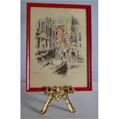 This John Haymson handcolored pen and ink print, "Venice" (the subtitle is illegible from the artist's script -- it may have something to do with a specific piazza), was apparently drawn in the 1940s. The print shows the first in a line of gondoliers chatting with prospective passengers alongside the water and his gondola. The perspective of the buildings shows the narrow passageway. The image extends to the red retro frame and is 9 x 12 inches.<p>