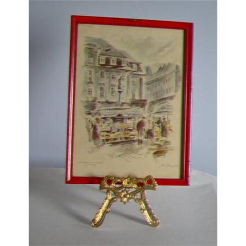 This John Haymson handcolored pen and ink print, ?Rathans, Heidelberg, Germany? (the first part of the title is illegible from the artist's script), was apparently drawn in the 1940s. The print shows market day in a public square in Heidelberg, Germany. People throng the fruit vendors, whose stands are in the shadow of a prominent statue. As people come and go, the intersection of the buildings shows the adjoining of the streets. The image extends to the red retro frame and is 9 x 12 inches.<p>