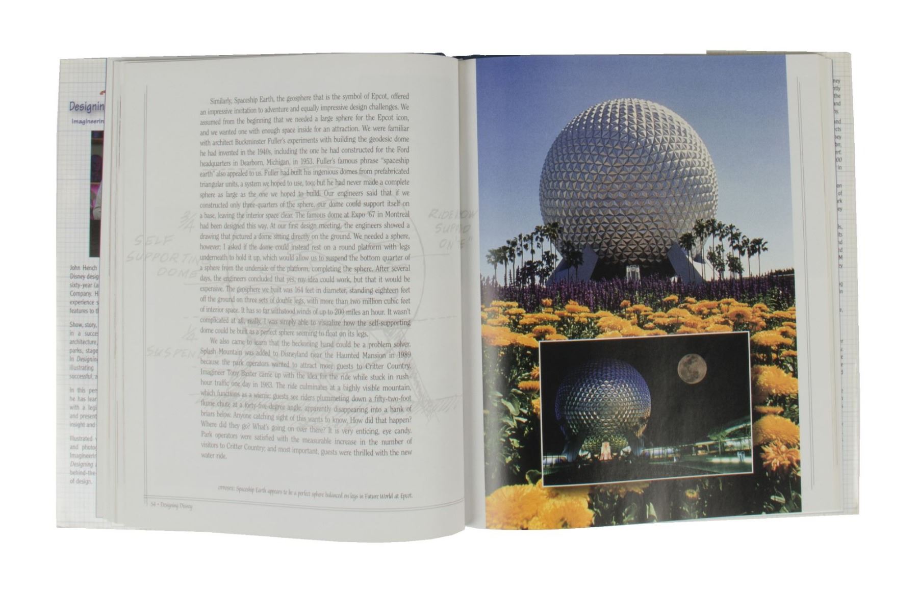 (Disney Editions, 2003) A first edition hardcover of John Hench's "Designing Disney: Imagineering and the Art of the Show". The book contains many of Hench's insights into the creation of the Disney parks and the philosophy that went into designing some of the park's most iconic attractions. With over 200 sketches, photos, and paintings depicted alongside Hench's descriptions, this incredible work archives the career of a true Disney Legend. Measuring 11"x9.5", the book is in very good condition with some cover-wear around the border.