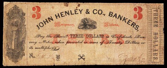 Montgomery, Alabama, 1862, $3, Issued obsolete banknote, black on red underprint, Small plow, rake, and shovel with sheaves in middle, counterfoil on left with locomotive, S.N 644, VG+ to almost Fine with a couple of small stains on the top margin, scarce and attractive note.