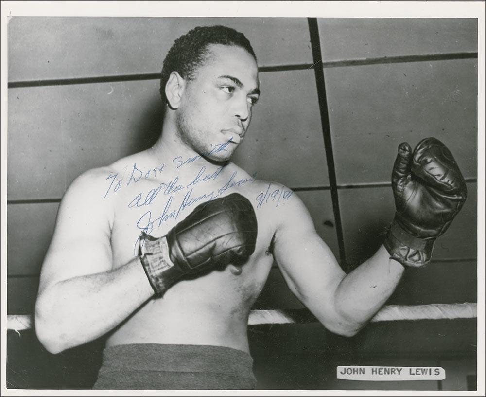 African American boxer who was the world Light Heavyweight champion from 1935 to 1939. Glossy 10 x 8 photo, signed and inscribed in blue ballpoint “To Don Smith, All the best, John Henry Lewis 9/19/71.” Light skipping to signature and inscription, and some small corner tip creases, otherwise fine condition. Accompanied by a full letter of authenticity from PSA/DNA.