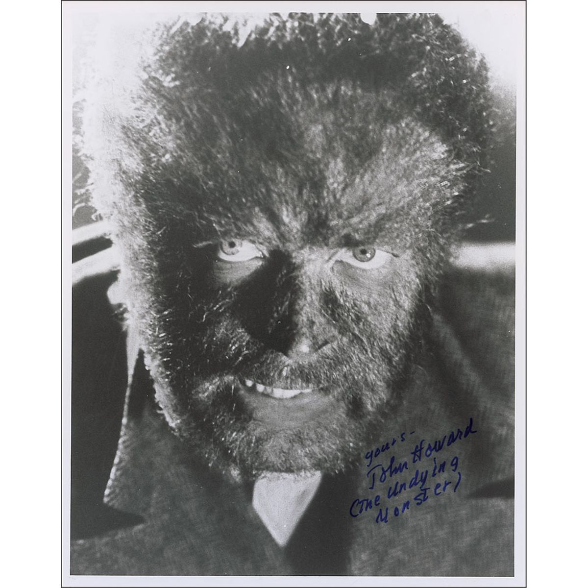 Rare glossy 8 x 10 close-up photo of Howard as the Undying Monster, signed in blue felt tip, “Yours—John Howard (The Undying Monster).” In fine condition, with a trivial spot to finish under signature.