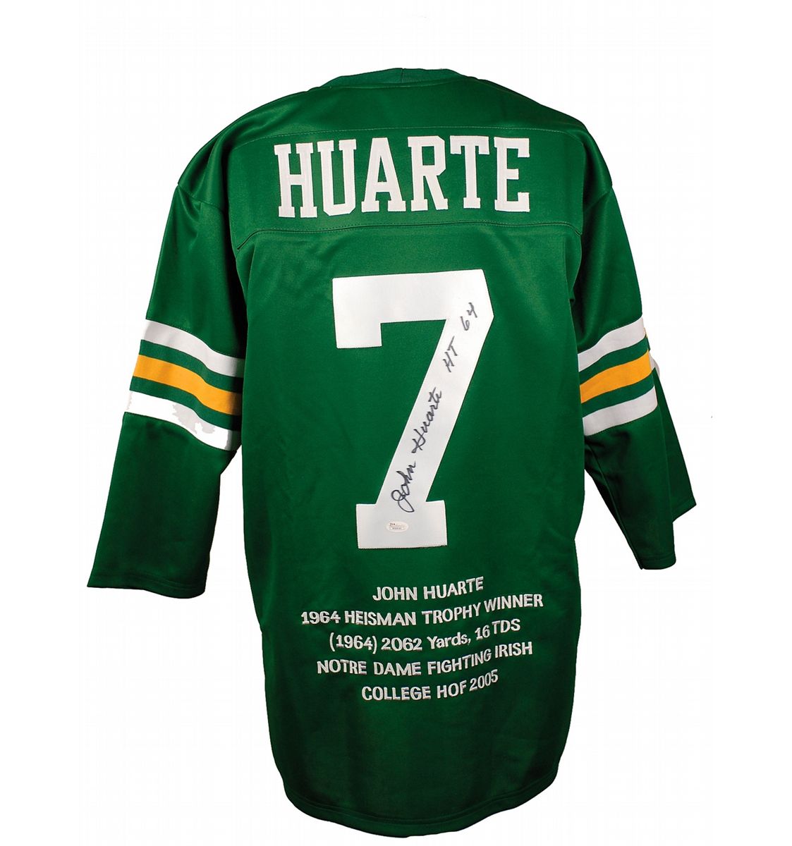 Commemorative Heisman Trophy replica football jersey, with sewn on letters and numbers and embroidered statistics, signed in black felt tip on the number on the back, “John Huarte HT 64.” In fine condition, with slight spreading to the signature and a JSA authentication label affixed to number. Accompanied by a certificate of authenticity from JSA.