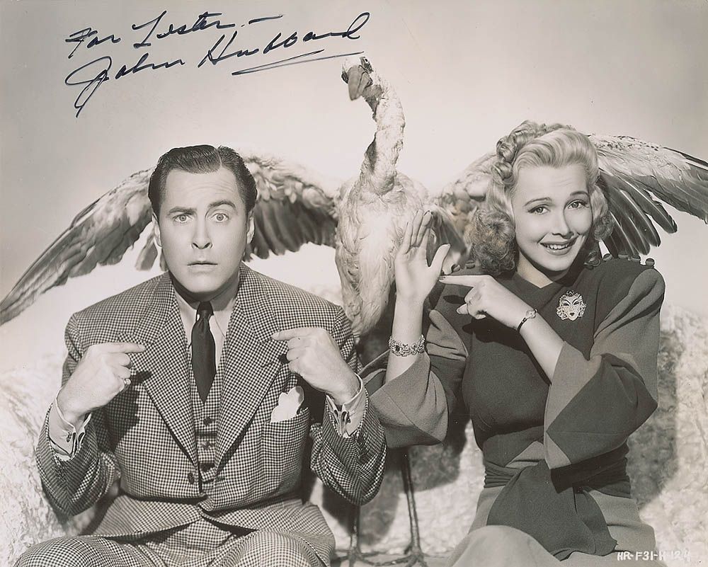 Amusing glossy 9.5 x 7.5 photo of Hubbard with Carole Landis in Turnabout, signed and inscribed in black felt tip “For Lester—John Hubbard.” Scattered bends and creases, and lightly trimmed edges, otherwise fine condition.