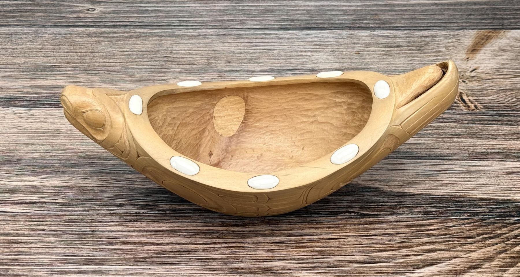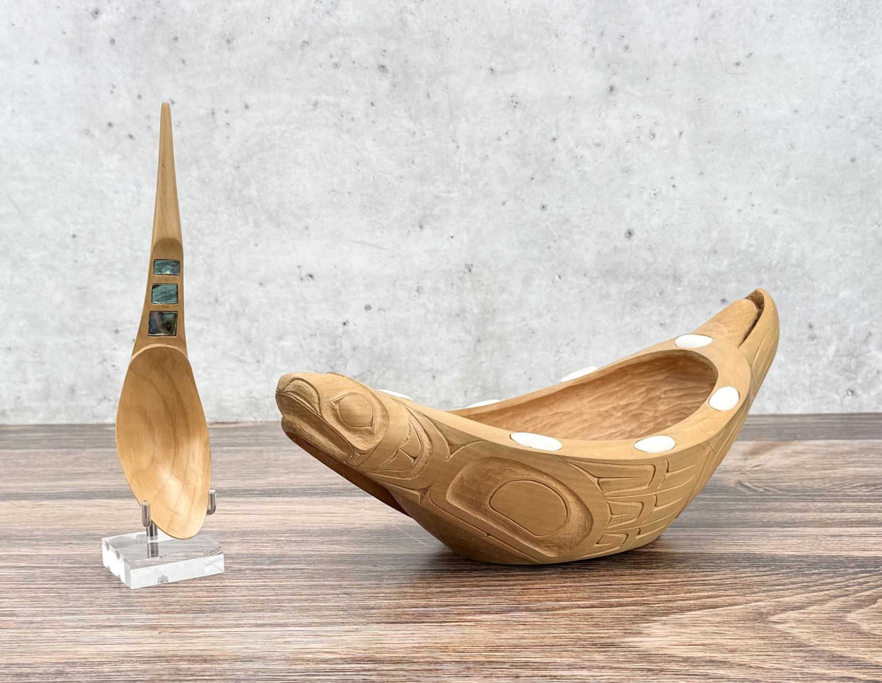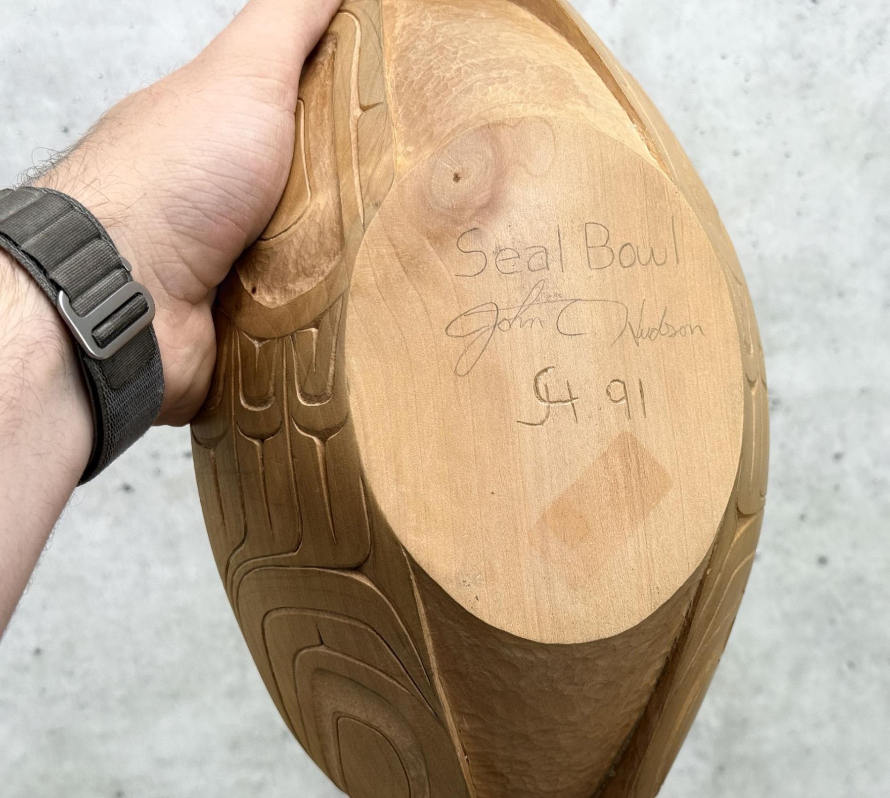 Seal Bowl. Made in 1991. Comes with matching spoon. 13 1/2" by 6 7/8" by 5". Provenance: Heard Museum, Arizona; Private Collection, New York. John has been teaching Northwest Coast art in Metlakatla since 2010 when he took over the program from his father, Jack Hudson, who started the program in the 1970s. John counts himself as one of countless students who have had their lives shaped in part by Jack’s vision. He learned to make art and the tools to create it from his father. Now, John teaches the sons and daughters of Jack’s former students using the same methods, techniques, and instruments developed over 40 years ago. Helping students to celebrate their culture with professional pieces of art is a great source of pride for John. Many of his students have sold their work or have been commissioned to create custom designs for community or regional projects. John has been an active member of NEA-Alaska and the Metlakatla Education Association where he serves as President. John credits the success of his program in part to the strength of his union and their ability to advocate for academic freedom in the classroom and reflect the ideals of his community.
