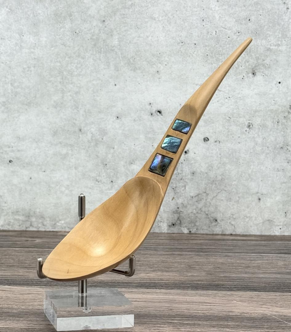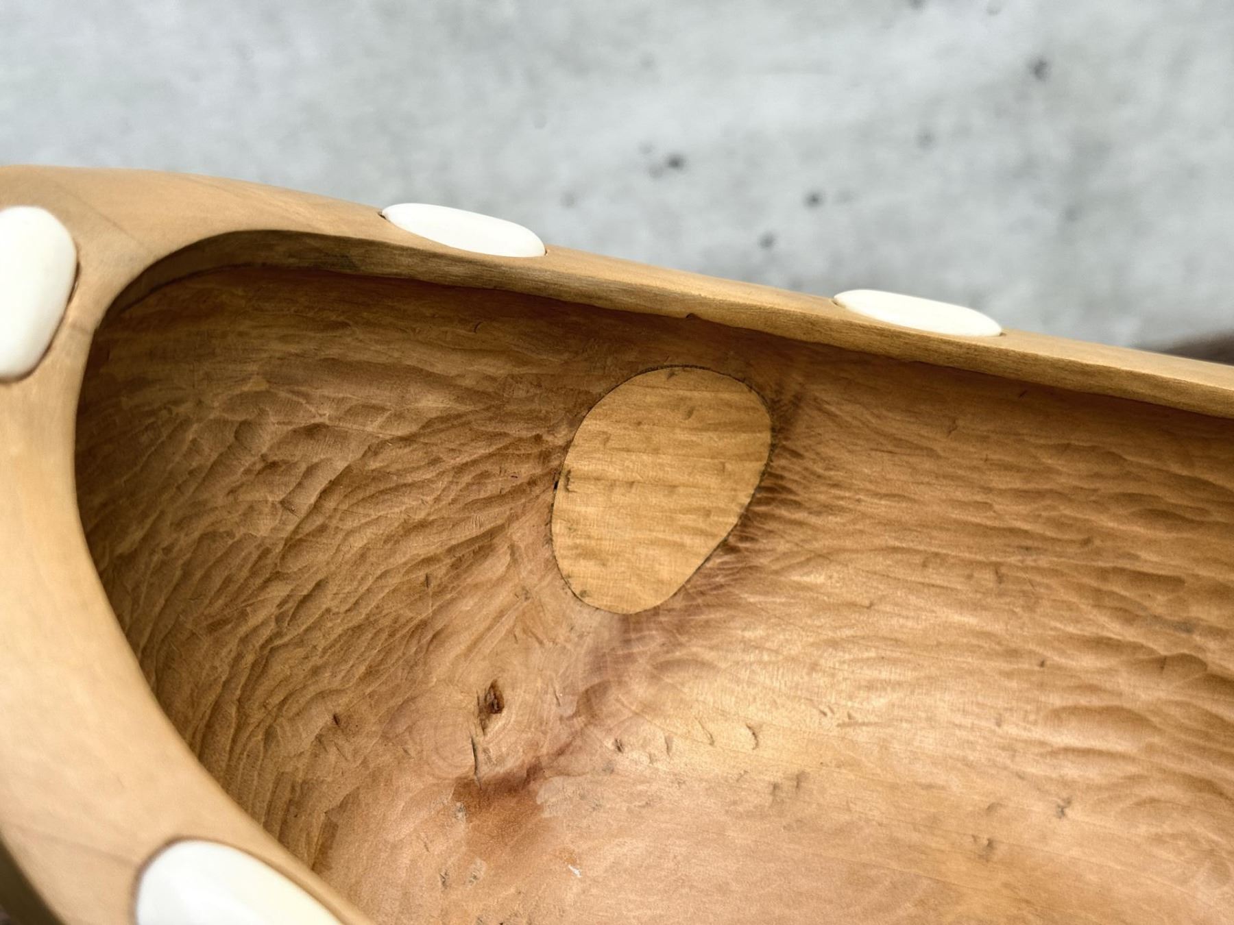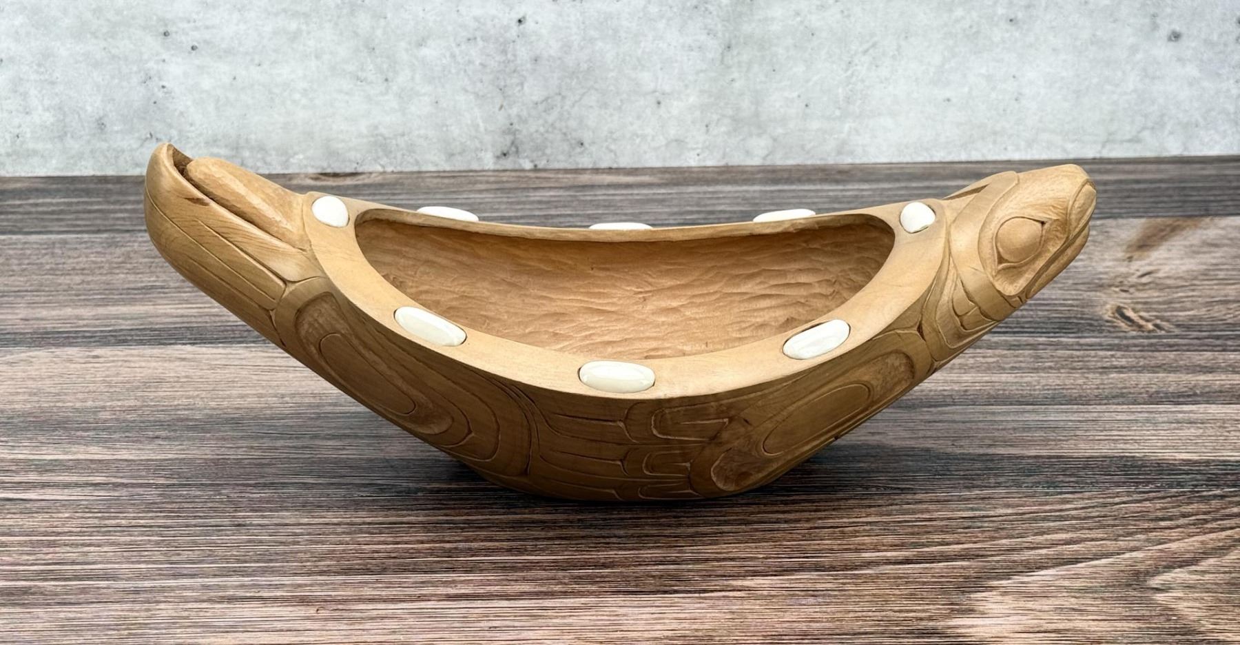 Seal Bowl. Made in 1991. Comes with matching spoon. 13 1/2" by 6 7/8" by 5". Provenance: Heard Museum, Arizona; Private Collection, New York. John has been teaching Northwest Coast art in Metlakatla since 2010 when he took over the program from his father, Jack Hudson, who started the program in the 1970s. John counts himself as one of countless students who have had their lives shaped in part by Jack’s vision. He learned to make art and the tools to create it from his father. Now, John teaches the sons and daughters of Jack’s former students using the same methods, techniques, and instruments developed over 40 years ago. Helping students to celebrate their culture with professional pieces of art is a great source of pride for John. Many of his students have sold their work or have been commissioned to create custom designs for community or regional projects. John has been an active member of NEA-Alaska and the Metlakatla Education Association where he serves as President. John credits the success of his program in part to the strength of his union and their ability to advocate for academic freedom in the classroom and reflect the ideals of his community.