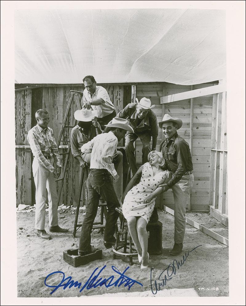 Glossy 8 x 10 behind-the-scenes photo from The Misfits, signed in blue felt tip by John Huston and in black felt tip by Arthur Miller. In fine condition.