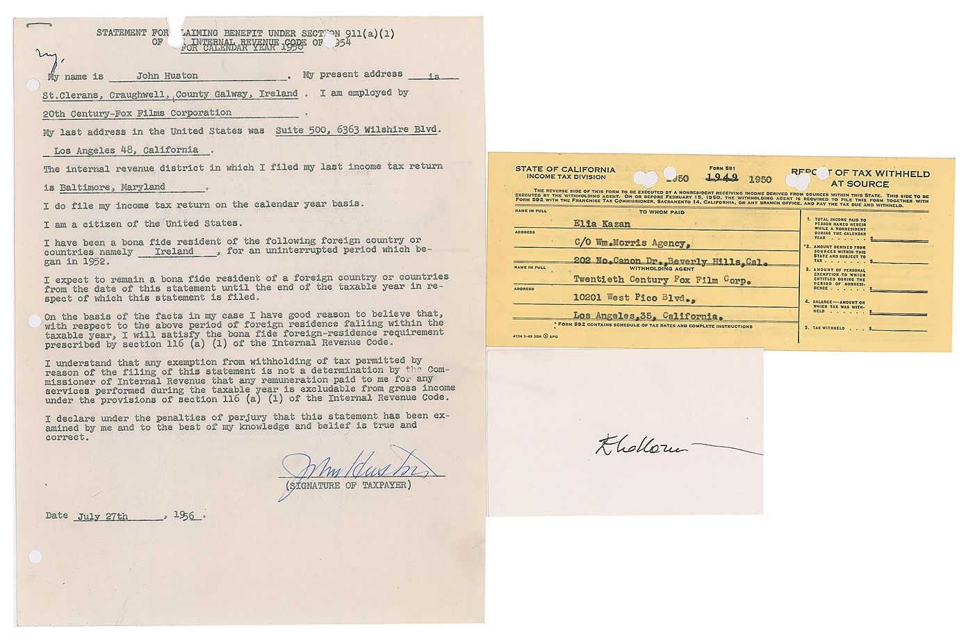 Three items: an ink signature, "Elia Kazan," on an off-white 5 x 3 card; a DS, one page, 8.5 x 3.5, January 16, 1950, a report of tax withheld at source from the state of California Income Tax Division, sent to Twentieth Century Fox Film Corporation, filled out in type and signed in ballpoint, "Elia Kazan"; and a DS, one page, 8.5 x 11, dated July 27, 1956, a statement for claiming benefit for calendar year 1956, signed at the conclusion in blue ballpoint, "John Huston," who affirms that he is a "bona fide resident" of Ireland. In overall fine condition.
