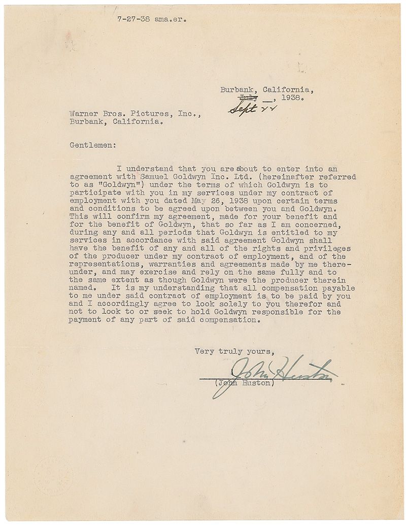 TLS, one page, 8.5 x 11, July 27, 1937. Letter to Warner Bros. In part: “I understand that you are about to enter into an agreement with Samuel Goldwyn Inc. Ltd…under the terms of which Goldwyn is to participate with you in my services under my contract of employment with you…It is my understanding that all compensation payable to me under said contract of employment is to be paid by you to me and I accordingly agree to look solely to you therefor and not to look to or seek to hold Goldwyn responsible for the payment of any part of said compensation.” Three horizontal folds, scattered creases, a uniform shade of toning, and a small tear to the upper left repaired with tape on the reverse, otherwise fine condition.