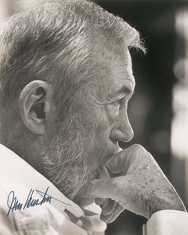 Satin-finish 8 x 10 close-up photo of Huston deep in thought, signed in black felt tip. In very fine condition.