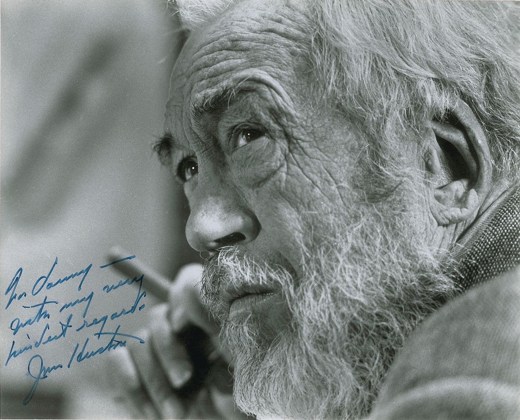 Two glossy photos: a 9.75 x 8 photo of Huston in an up-close pose, signed and inscribed in black felt tip, "For Danny—with my very kindest regards, John Huston"; and a 10 x 8 Avco Embassy Pictures publicity photo of Huston for the 1979 film Winter Kills, signed in black felt tip, "John Huston." In overall fine condition.