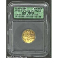 <TR><TD width="100%"><TABLE cellSpacing=1 cellPadding=3 width="100%" border=0><TBODY><TR><TD width="100%" bgColor=#79735c><FONT face=arial color=#ffffff size=3><B>Description</B> </FONT></TD></TR><TR><TD width="100%" bgColor=#ffffff><FONT face=arial size=2><B>John III,</B></I> 1222-1254 A.D., AV hyperpyron (3.33 g), Christ, enthroned, facing/The Virgin, facing, crowning John III, to left. SB 2073, MS63 ICG. </FONT></TD></TR></TBODY></TABLE></TD></TR></TBODY></TABLE><BR><A name=PricesRealized></A><TABLE cellSpacing=0 cellPadding=0 width="100%" bgColor=#000000 border=0><TBODY><TR><TD width="100%"><TABLE cellSpacing=1 cellPadding=3 width="100%" border=0><TBODY><TR><TD width="100%" bgColor=#79735c><A name=PR><FONT face=arial color=#ffffff size=3><B>Previous Prices from Heritage Auctions</B> </FONT></A></TD></TR><TR><TD bgColor=#f6f6ed>No Prior Data Recorded </TD></TR><TR><TD bgColor=#ffffff><FONT face=arial size=1 ?>PLEASE NOTE: All prices realized reflect the final hammer price PLUS the buyer's premium in auctions that charge a buyer's premium. Each item has a notation at the top of the listing indicating whether that lot included a buyer's premium. Example: A item that sells with a final hammer price of $100 and a 20% buyer's premium will display with a price realized of $120. All information listed is intended to be as accurate as possible, but errors are possible. Please use this guide carefully and inform us of any inaccuracies. </FONT></TD></TR></TBODY></TABLE></TD></TR></TBODY></TABLE><BR><TABLE cellSpacing=0 cellPadding=0 width="100%" bgColor=#000000 border=0><TBODY><TR><TD width="100%"><TABLE cellSpacing=1 cellPadding=3 width="100%" border=0><TBODY><TR><TD width="100%" bgColor=#79735c colSpan=6><FONT face=arial color=#ffffff size=3><B>Price Guide*</B> </FONT></TD></TR><TR bgColor=#f6f6ed><TD align=middle><B>Grade</B> </TD><TD align=middle><B>Coin World<BR>(Trends)</B> </TD><TD align=middle><B>Numismedia<BR>Retail</B> </TD><TD align=middle><B>Numismedia<BR>Wholesale</B> </TD><TD align=middle><B>Coin<BR>Universe</B> </TD><TD align=middle><B>Heritage<BR>Value Index</B> </TD></TR><TR bgColor=#ffffff><TD align=middle>62</TD><TD align=right>---</TD><TD align=right>---</TD><TD align=right>---</TD><TD align=right>---</TD><TD align=right>---</TD></TR><TR style="FONT-WEIGHT: bold" bgColor=#cccfdd><TD align=middle>63</TD><TD align=right>---</TD><TD align=right>---</TD><TD align=right>---</TD><TD align=right>---</TD><TD align=right>---</TD></TR><TR bgColor=#ffffff><TD align=middle>64</TD><TD align=right>---</TD><TD align=right>---</TD><TD align=right>---</TD><TD align=right>---</TD><TD align=right>---</TD></TR><TR bgColor=#ffffff><TD colSpan=6><FONT size=1>*All information listed is intended to be as accurate as possible, but errors are possible. No item may be returned or refused based on this information which is provided as a service to our customers. You should contact each pricing source directly to determine the accuracy of this information. </FONT></TD></TR></TBODY></TABLE></TD></TR></TBODY></TABLE><BR><TABLE cellSpacing=0 cellPadding=0 width="100%" bgColor=#000000 border=0><TBODY><TR><TD width="100%"><TABLE cellSpacing=1 cellPadding=3 width="100%" border=0><TBODY><TR><TD width="100%" bgColor=#79735c><FONT face=arial color=#ffffff size=3><B>Population Guide</B> </FONT></TD></TR><TR bgColor=#ffffff><TD align=middle></TD></TR></TBODY></TABLE></TD></TR></TBODY></TABLE><BR><TABLE cellSpacing=0 cellPadding=0 width="100%" bgColor=#000000 border=0><TBODY><TR> Important notice: We expect to be auctioning lots at the rate of 200-250 per hour. On occasion eBay live bid software cannot keep up with the pace of the auctions where 4-5 lots per minute can hammer down, so we recommend that you place a realistic absentee bid now as insurance to avoid disappointment. Also please note that all Heritage/CAA lots purchased through eBay Live carry a 20% Buyer's Premium. Please make sure you read the Terms and Conditions.