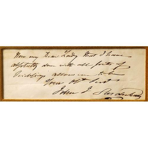 <Our item number 135724><B>Audubon, John J.</B> (1785-1851) Ornithologist, naturalist, and painter. Autograph sentiment signed, 2½ x 6½ in., n.p., n.d. To an unknown woman, he inscribes, "Now my Dear Lady that I haveā¦done with all sorts of scribblings allow me to be Your obt. Servt. John J. Audubon." Fine; light toning; frame needs retouching. Matted with a portrait of Audubon and framed to an overall size of 17 x 13½ in. With a COA from the late autograph dealer Charles Hamilton on the verso. <BR>Estimated Value $600 - 800. <BR><BR>Our item number 135724<BR><IMAGES><P ALIGN="CENTER"><IMG SRC="http://www.goldbergcoins.net/liveauction/49jpegs/135724.jpg"> </P></IMAGES>