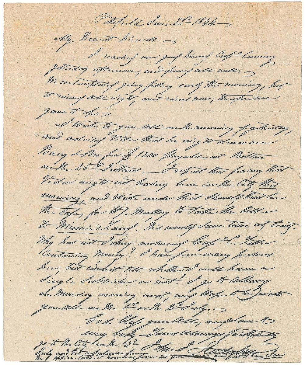 Scarce ALS, one page, 7.5 x 9.25, June 22, 1844. Letter to his sons, Victor and John, in part: “I reached our good friend Capt. Cummings yesterday afternoon, and found all well. We contemplated going fishing early this morning, but it rained all night, and rains now; therefore we gave it up. I wrote to you all in the morning of yesterday, and advised Victor that he might draw on Barry & Bro for $1200 payable at Boston on the 25th instant. I repeat this, fearing that Victor might not having been in the city this morning, and wrote under that should that be the case, for Mallory to take the letter to Minnie’s Land. This would save time at least. Why has not Johny answered Capt. C’s letter containing money? I have seen many persons here, but cannot tell whether I will have a single subscriber or not! I go to Albany on Monday morning next and hope to be with you all on the 1st or the 2nd July. God bless you all, and Love to everybody.” In a postscript he adds, “Go to the city on the 3rd July and get a balance from the office. Take it home as soon as you can.” In very good to fine condition, with multiple intersecting folds, scattered creasing, and seal-related paper loss to the adjoining address leaf.