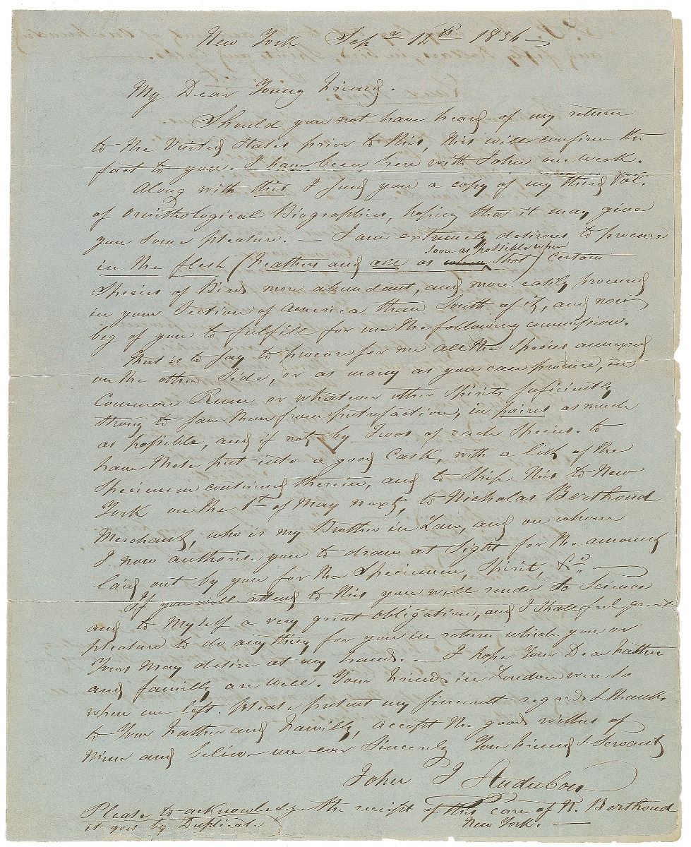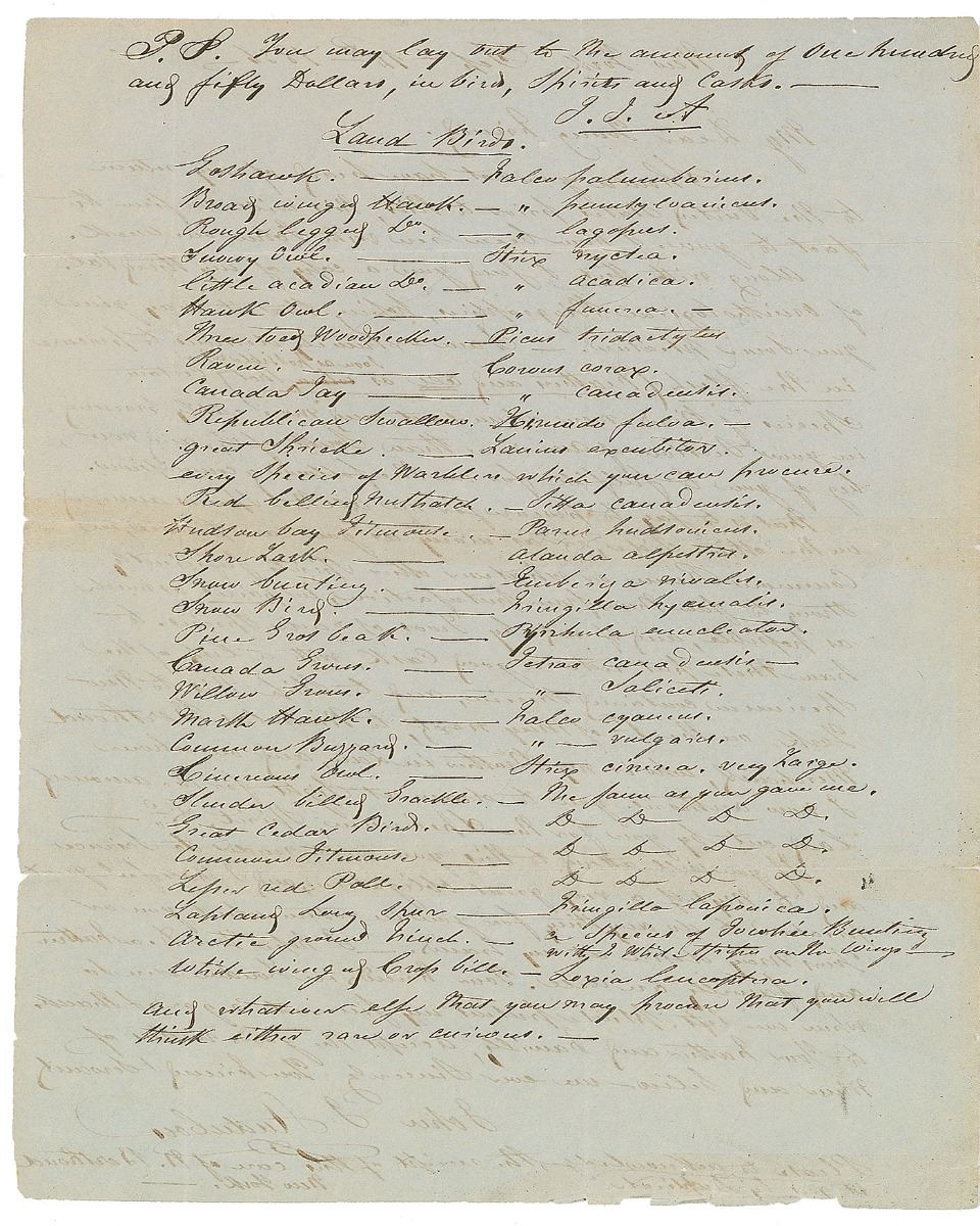 ALS, three pages on two adjoining sheets, 8.75 x 10.75, September 12, 1836. Letter to Thomas McCulloch concerning his ornithological work. In part: “Should you not have heard of my return to the United States prior to this, this will confirm the fact to you. I have been here with John one week. Along with this, I send you a copy of my third Vol. of Ornithological Biographies, hoping that it may give you some pleasure.—I am extremely desirous to procure in the flesh (feathers and all) as soon as possible when that species of bird [is] more abundant, and more easily procured in your section of America than South of it, and now beg of you to fulfill for me the following commission. That is to say to procure for me all the species annexed on the other side, or as many as you can procure, in Common Rum or whatever other spirits sufficiently strong to save them from putrefaction, in pairs as much as possible, and if not, by two of each species, to have these put into a good cask, with a list of the species contained therein, and to ship this to New York…If you will attend to this you will render to Science and to myself a very great obligation, and I shall feel great pleasure to do anything for you in return which you or yours may desire at my hands.” On the following pages, Audubon lists numerous species of birds he would like specimens of, including both their common and scientific names, with a few including the “Snowy Owl,” “Three Toed Woodpecker,” “Raven,” “Hudson Bay Titmouse,” “Canada Swan,” “Common Buzzard,” “March Hawk,” and “Arctic Ground Finch.” In fine condition, with splitting along intersecting folds.