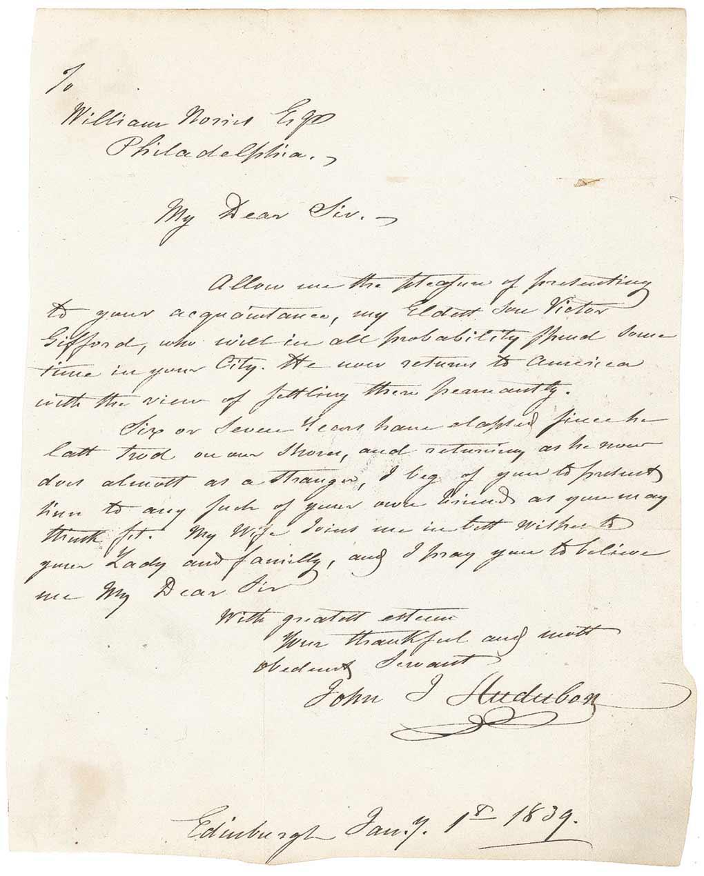 ALS, one page slightly irregularly trimmed in size to approximately 6.25 x 8, January 1, 1839. Audubon writes from Edinburgh to William Norris in Philadelphia. In full: “Allow me the pleasure of presenting to your acquaintance, my eldest son Victor Gifford, who will in all probability spend some time in your City. He now returns to America with the view of settling there permanently. Six or seven years have elapsed since he last trod on our shores, and returning as He now does almost as a stranger, I beg of you to present him to any such of your own friends as you may think fit. My wife joins me in best wishes to your Lady and family, and I pray you to believe me my Dear Sir, with greatest esteem.” In very good condition, with trimming as noted, intersecting folds (vertical fold to last name), light wrinkling and handling wear, and light toning at corners from mounting remnants to reverse. The writing is clear and dark throughout.