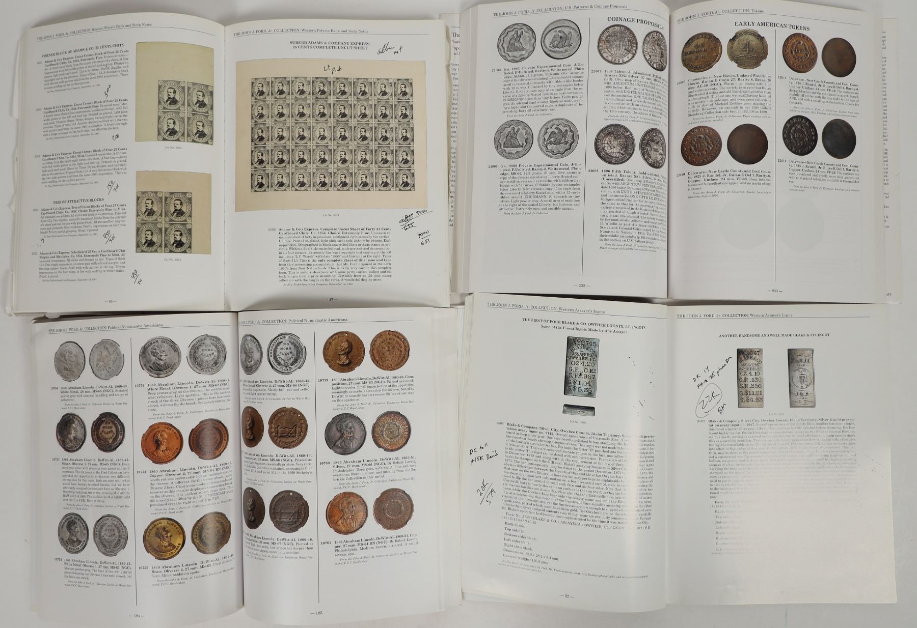 Lot of (4). Famous John J. Ford Sales catalogs, Stack's Numismatists Auctions. Mint condition, Coins, Medals & Currency Auctions, plus others. Listings for western paper americana, private and territorial pattern coins, medals (foreign and domestic), balance scales, Assayer's Ingots, and many other titles. The Western Assayer's Ingots catalog (2007) is particularly interesting, photos and descriptions of ingot lots from all over the west, including Virginia City. These are from Fred Holabird's private collection, and contain pages with his hand-written notes and memos. Fascinating photos and descriptions abound, please review.