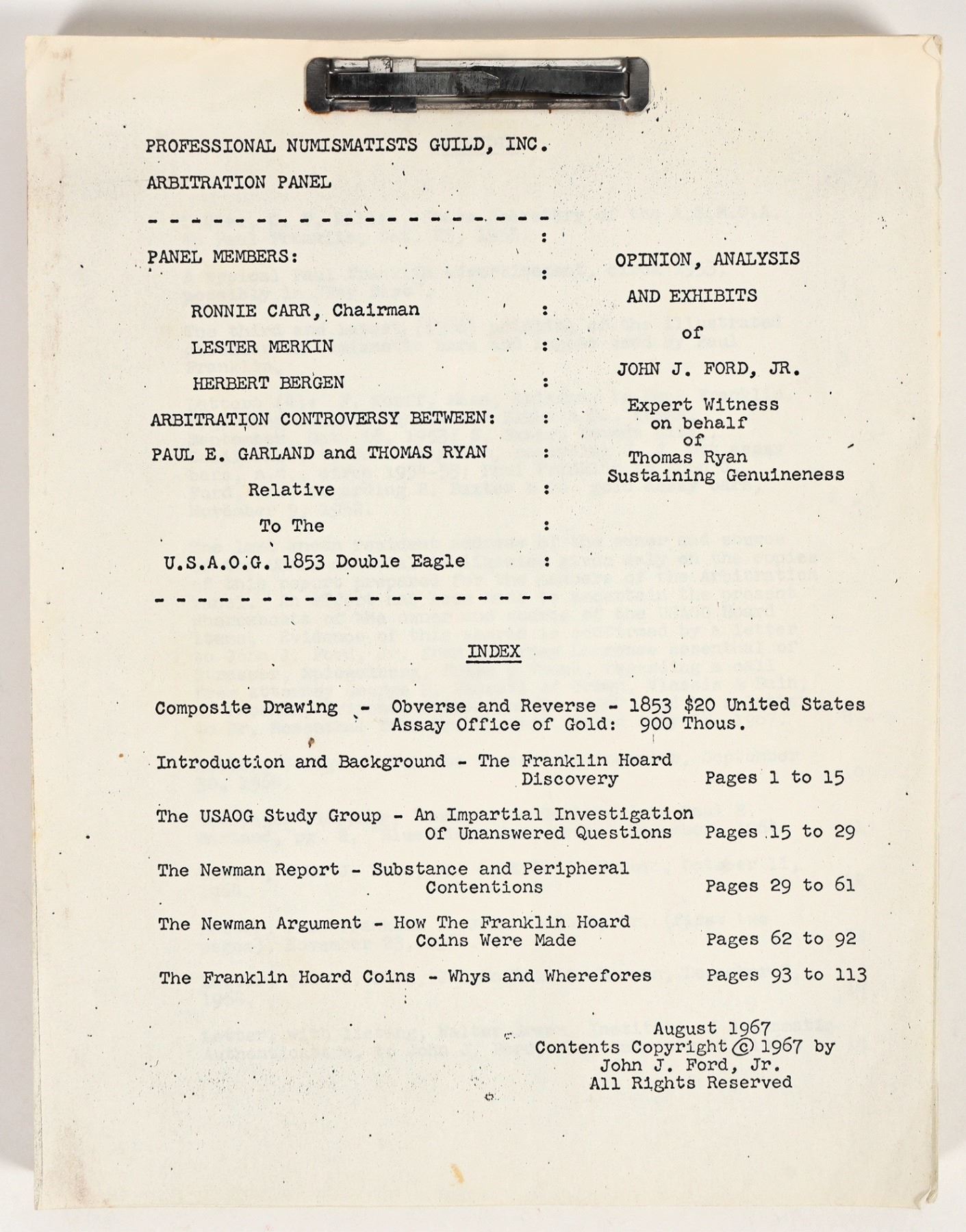 An old, perhaps contemporary photocopy of the August 1967 text of John J. Ford's Opinion, Analysis and Exhibits presented to the Professional Numismatists Guild arbitration panel concerning the "Arbitration Controversy Between: Paul E. Garland and Thomas Ryan relative to the U. S. A. O. G. 1853 Double Eagle. 8.5 x 11 inch sheets, bound at top; 113 page transcript with 42 page appendix. Previously sold in the January 2011 Kolbe & Fanning auction as lot 443. Important information concerning the Franklin Hoard and the people involved.