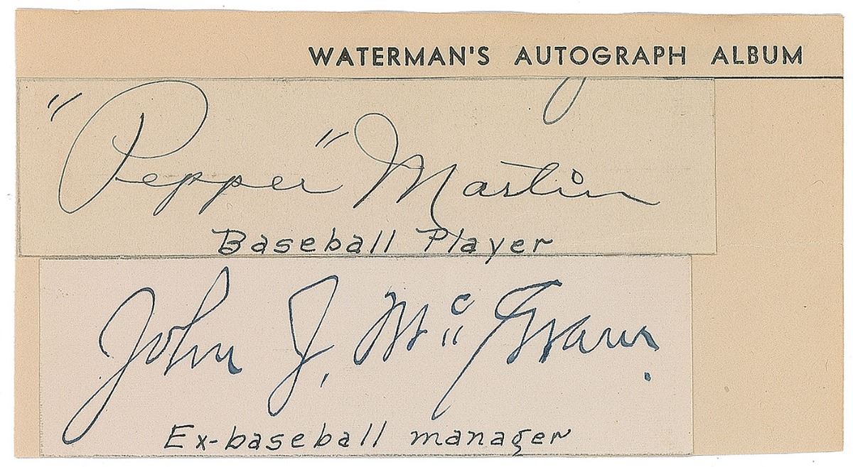 Quick-tempered Hall of Famer who, after a very successful career as a player from 1891 through 1906, became known as one of the greatest managers in baseball history (1873–1934). Scarce fountain pen signature, “John J. McGraw,” on an off-white 3.5 x 1 card affixed to a clipped page removed from a Waterman’s autograph book, which also bears a signature of Pepper Martin. In fine condition.