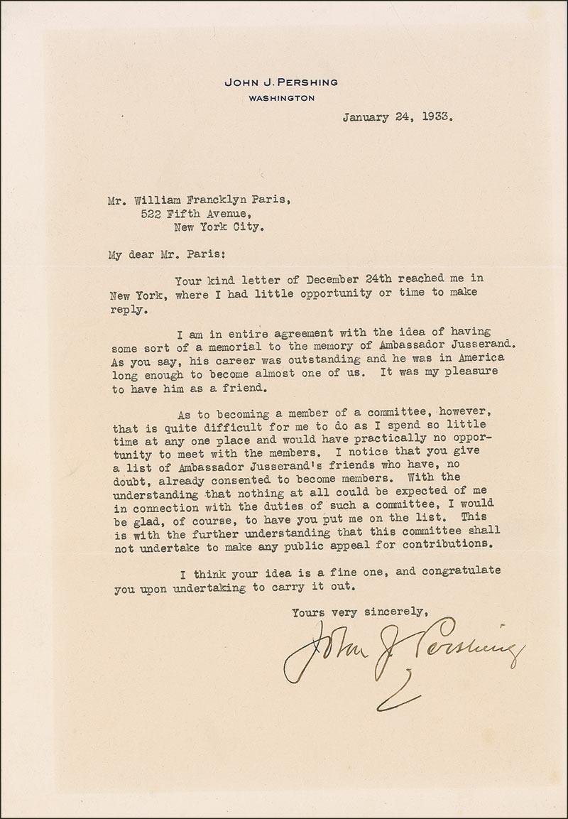 TLS, one page, 7.25 x 10.5, personal letterhead, January 24, 1933. Letter concerning his appointment to a memorial committee. In part: “I am in entire agreement with the idea of having some sort of memorial to the memory of Ambassador Jusserand. As you say, his career was outstanding and he was in America long enough to become almost one of us. It was my pleasure to have him as a friend…With the understanding that nothing at all could be expected of me in connection with the duties of such a committee, I would be glad, of course, to have you put me on the list. This is with the further understanding that this committee shall not undertake to make any public appeal for contribution.” In fine condition, with a light block of uniform toning over text from previous display, and a few creases. Jean Jules Jusserand was a French diplomat who served as ambassador to the United States from 1902 to 1925. A close friend of every US President during that period, he did much to promote friendly Franco-American relations and to win the United States to the Allied side in World War I.