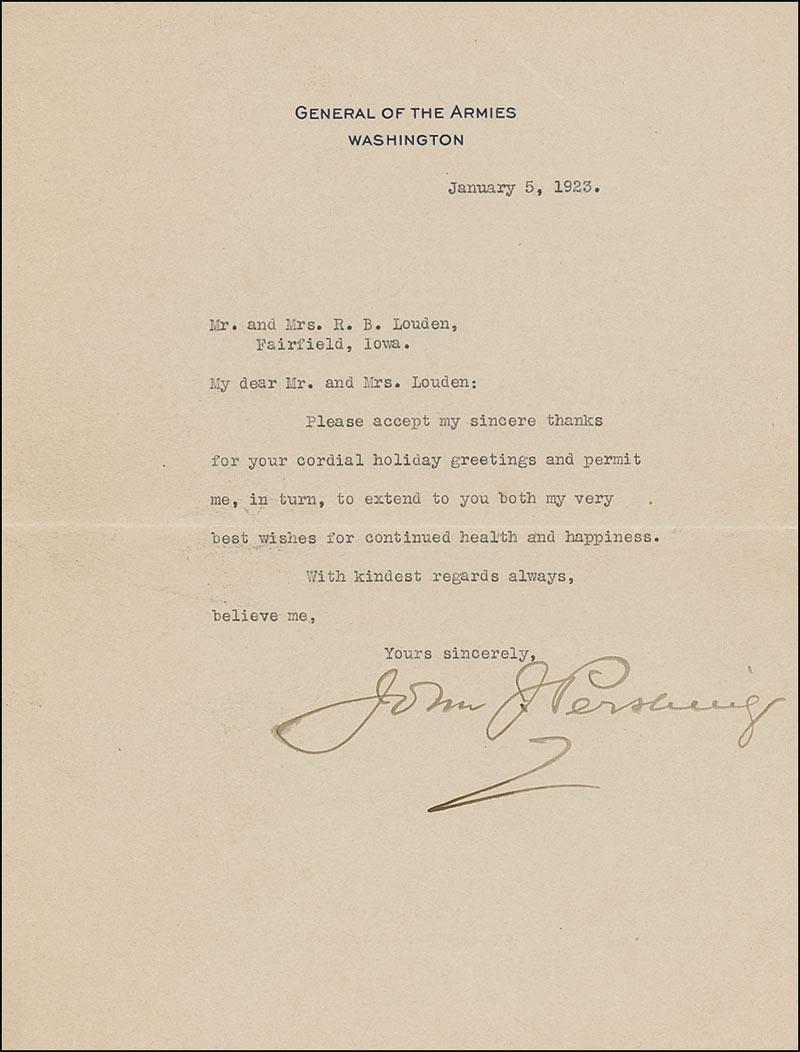 TLS, one page, 7 x 9.5, General of the Armies letterhead, January 5, 1923. Letter of thanks for holiday greetings. In full: “Please accept my sincere thanks for your cordial holiday greetings and permit me, in turn, to extend to you both my very best wishes for continued health and happiness.” In fine condition, with a uniform shade of light toning, diagonal crease to top right corner, and a small ink blotch to first stroke of signature.